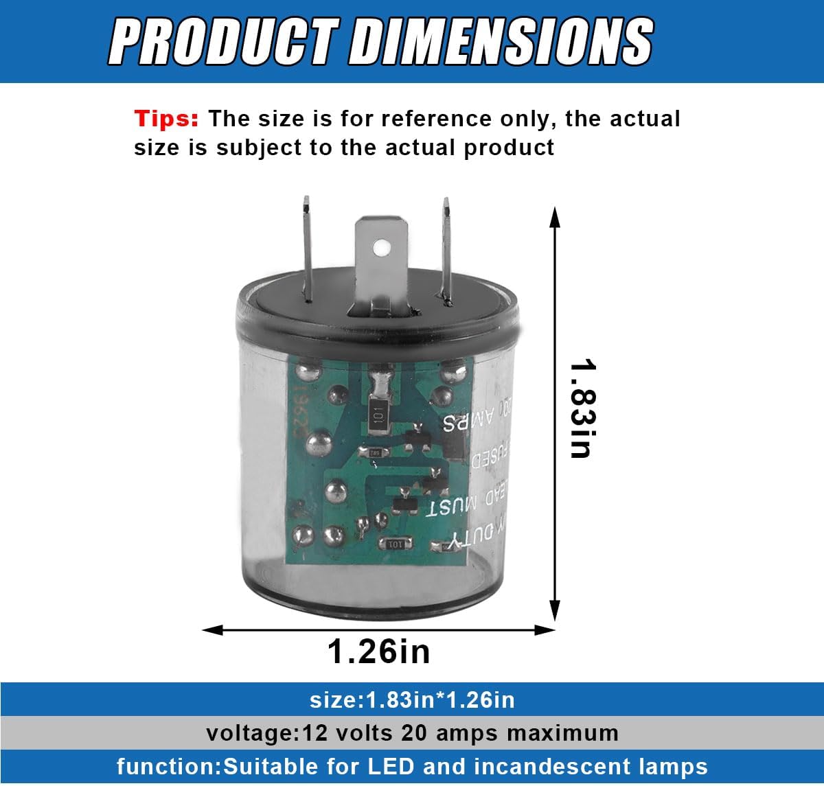 【Specification】:You will receive 2pcs 3-pin flash relay, rated current: 20A; Operating voltage: 12 V; Product size: 1.83 × 1.26 inches.