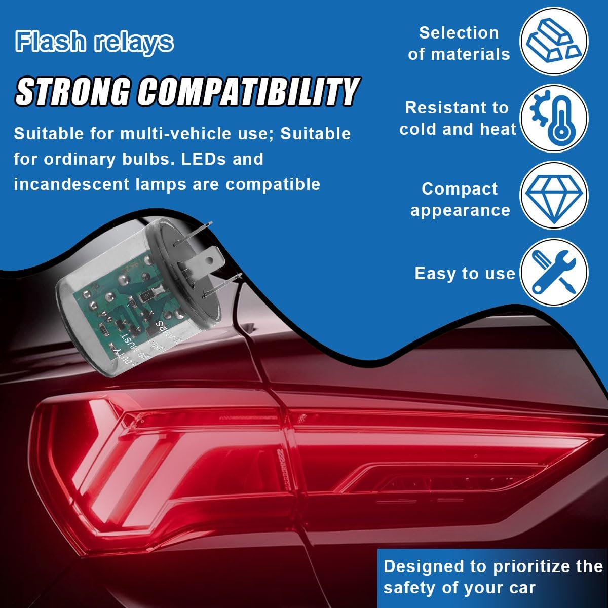 【Reliable Material】:This LED flash relay shell is made of thickened plastic, sturdy, high temperature resistant, not easy to deform, has structural stability, shock and vibration resistance, and corrosion resistance with flame retardant, the coil and pins are made of pure copper, has a good electrical conductivity, the temperature and power consumption is very low, and has a good waterproof and dust-proof performance, can withstand all kinds of extremely bad weather.