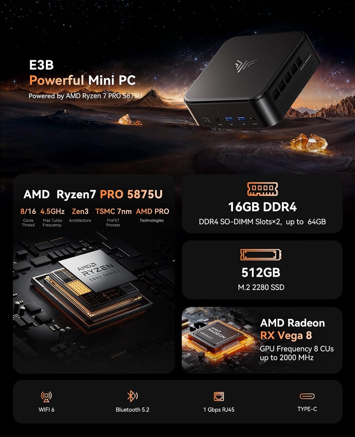 【AMD Ryzen 7 Pro 5875U Processor Gaming Pc】Elevate Your Gaming and Productivity with KAMRUI E3B Mini Gaming PC, KAMRUI E3B mini gaming pc is equipped with a high-performance AMD Ryzen 7 Pro 5875U CPU, (8Core 16 Threads, Up to 4.5GHz, 16MB L3 Cache), Compared with Ryzen 7 5700U, Ryzen 5 5600U, 5500U, and Intel Core i7-1165G7, the Mini pc Ryzen 7 Pro 5875U provides better multi-threading performance, delivering improved performance in multitasking and multi-threaded applications. With integrated AMD Radeon RX Vega 8 Graphics running at 2000MHz, it's perfect for creative software like Photoshop (PS), Premiere Pro (PR), Illustrator (AI).