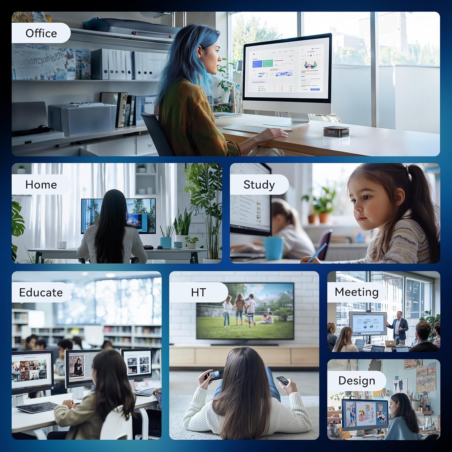 【FIND MORE BONUS ON E1】With a sleek design that lights up blue when it's on.Looks pretty cool in low lighting.Designed with 1 x DC,2 x USB 3.0,2 x USB 2.0,1 x RJ45 Gigabit Ethernet port,2 x HDMI ports,1 x audio input/output,which can be connected to your multimedia devices,mouse,acoustics or headset.Small pc supports multiple device connections and can be used with servers,monitoring equipment, office equipment,displays,projectors,televisions,etc.Whether a compact size or lightweight becomes your optimum portable mini desktop pc for the business trip.