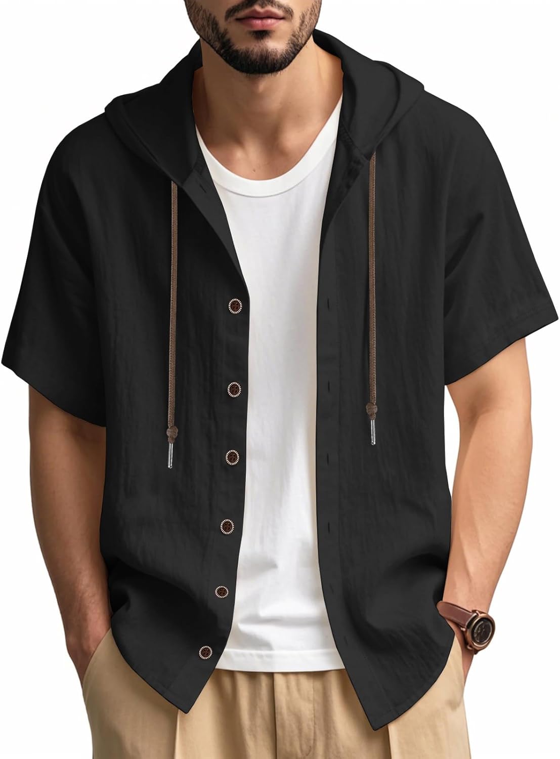 This men's linen shirt features short sleeves, button closures, and a drawstring hood, blending practicality with style. The classic button-up design paired with the casual drawstring hood creates a unique urban vibe, making it versatile for various occasions.