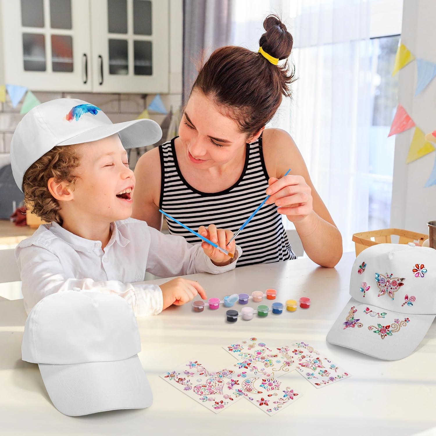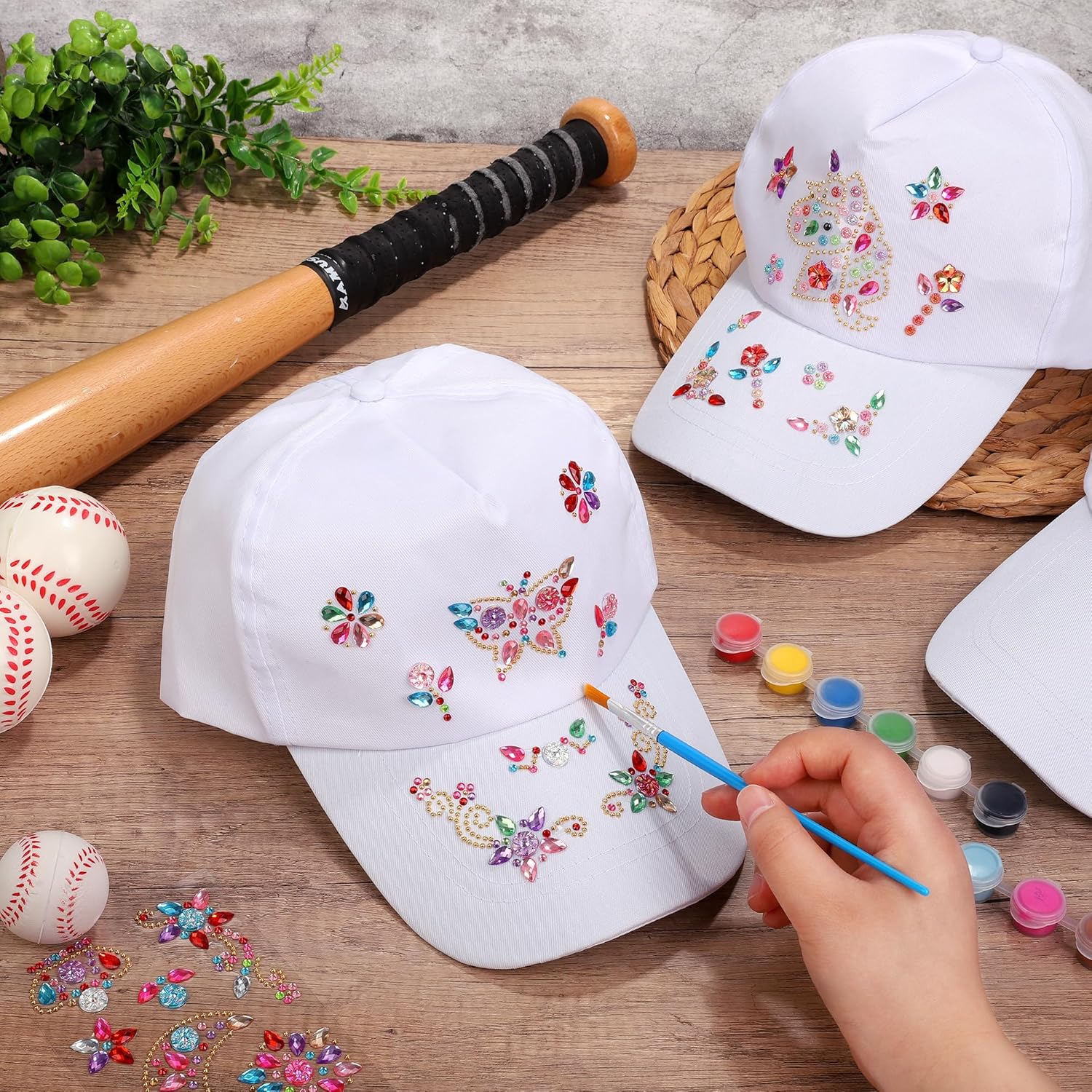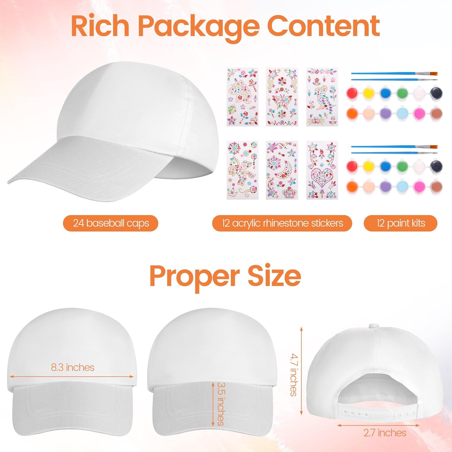 Value pack: you will receive 24 summer DIY baseball caps, 12 acrylic paint kits with 24 tubes of paint and 24 brushes, and 12 sheets of acrylic rhinestone stickers, enough quantity to meet your daily use, replacement needs and DIY needs, the painting baseball caps bulk suits group activities; dive into crafting and enjoy endless fun