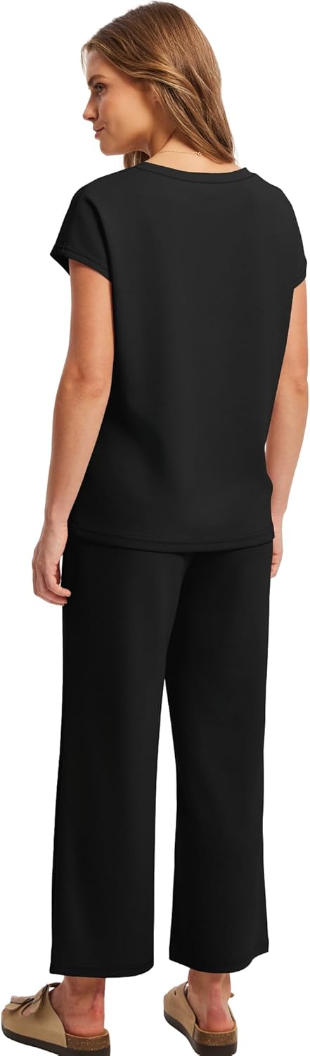 ✦Design: Two piece sets for women V neck cap sleeve tops,wide leg pants,contoured back for the most flattering rear view,elastic drawstring.
