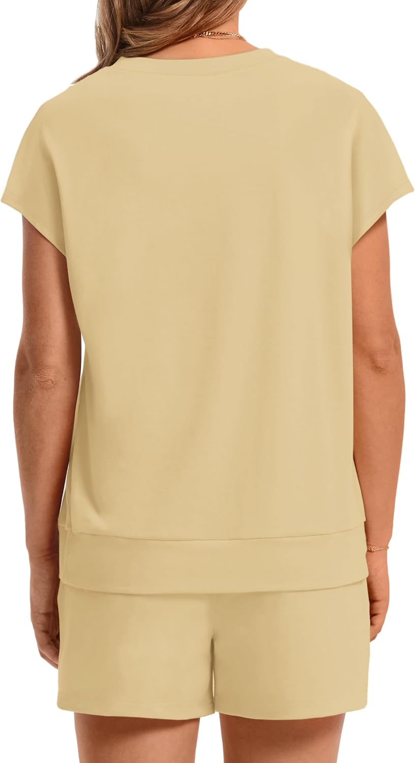WIHOLL Two Piece Sets for Women Summer Crew Neck Lounge Short Sets Cap Sleeve Drawstring Sweatsuit with Pocket