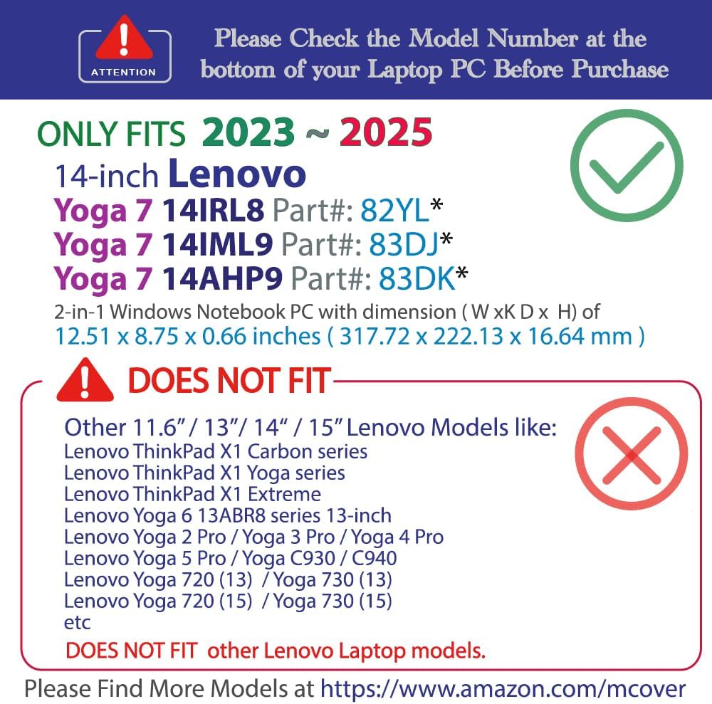 Designed to ONLY fit the 2023 - 2025 14" Lenovo Yoga 7 14IRL8 | 14IML9 | 14AHP9 series 2-in-1 Windows Notebook Computers with dimension of 12.51 x 8.75 x 0.66 inches ( 317.72 x 222.13 x 16.64 mm )