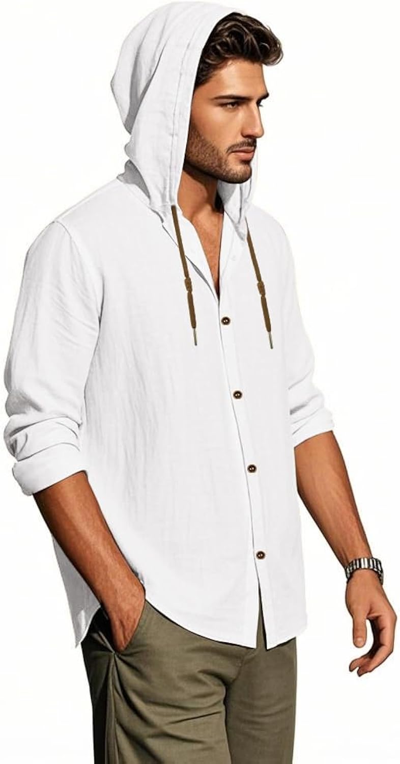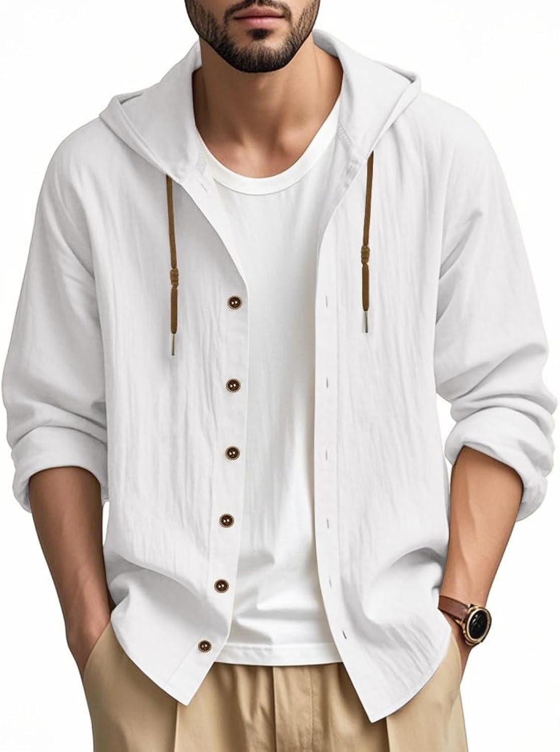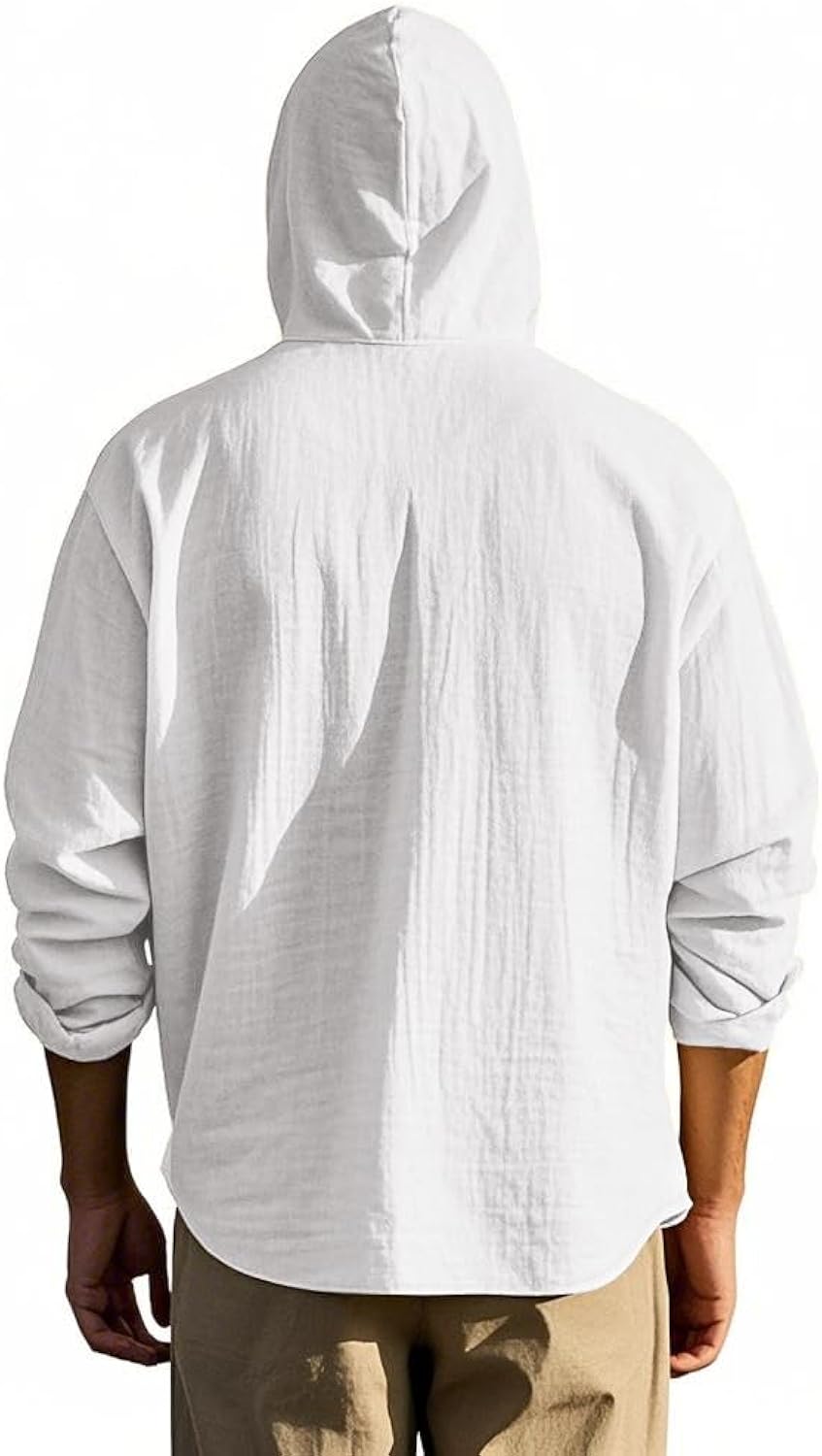 This men's cotton linen shirt features long sleeves, button closures, and a drawstring hood, blending practicality with style. The classic button-up design paired with the casual drawstring hood creates a unique urban vibe, making it versatile for various occasions.
