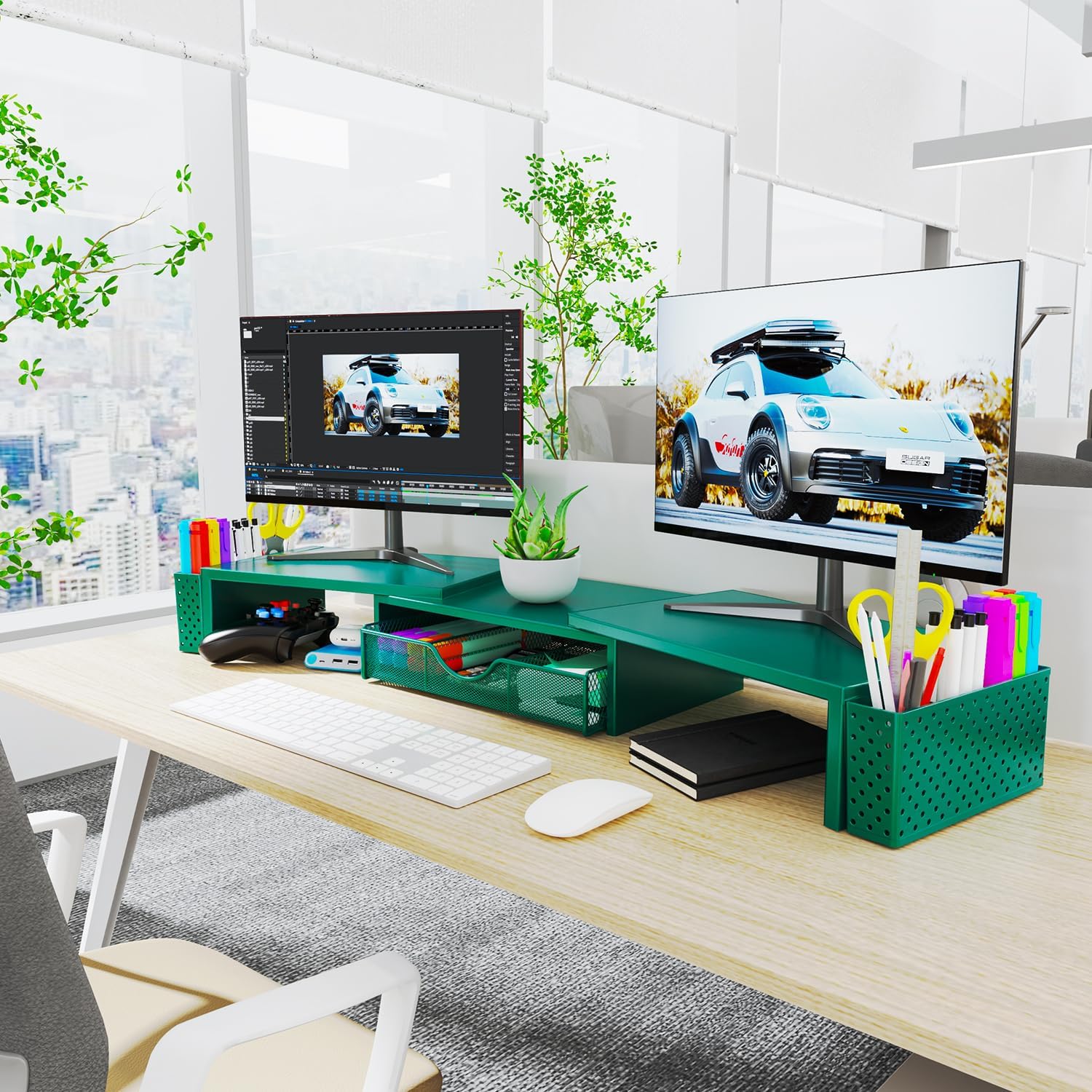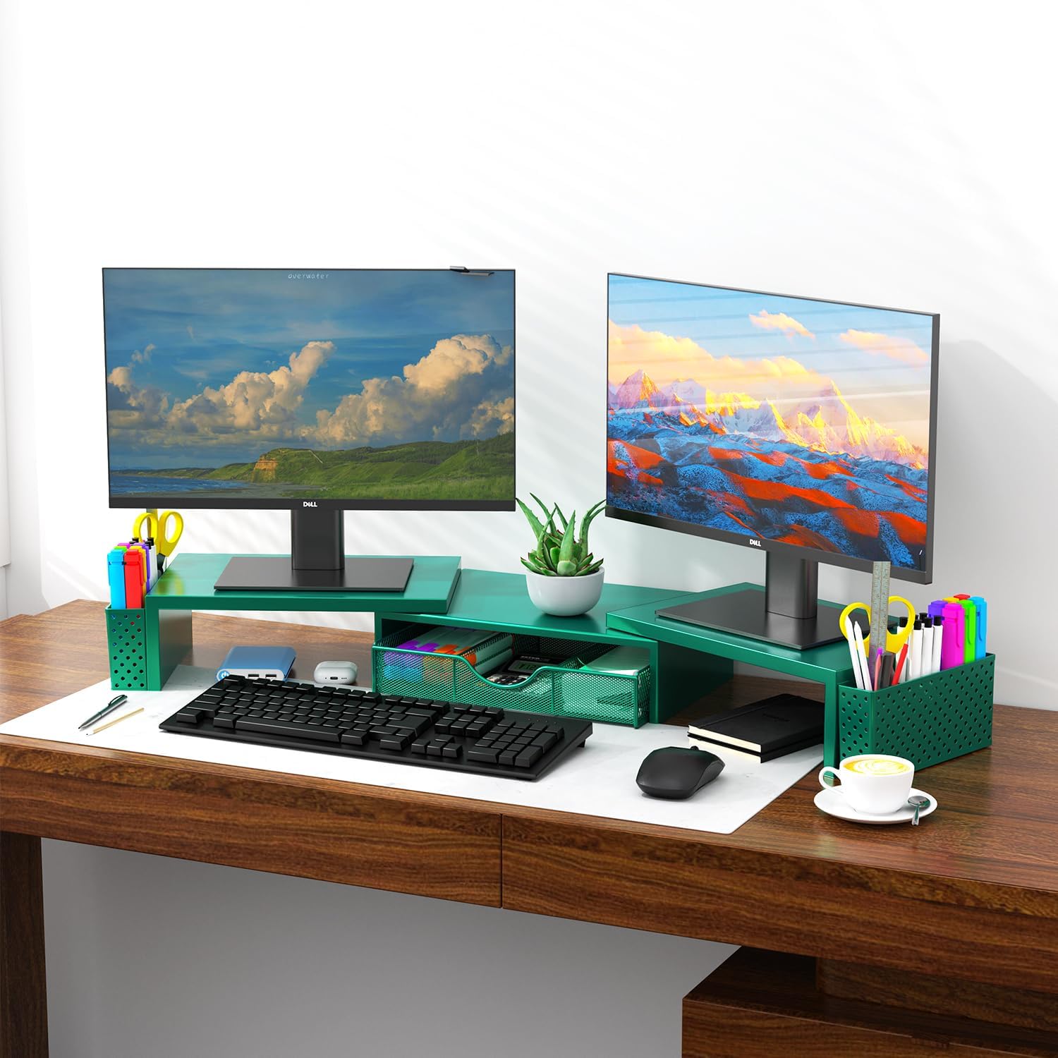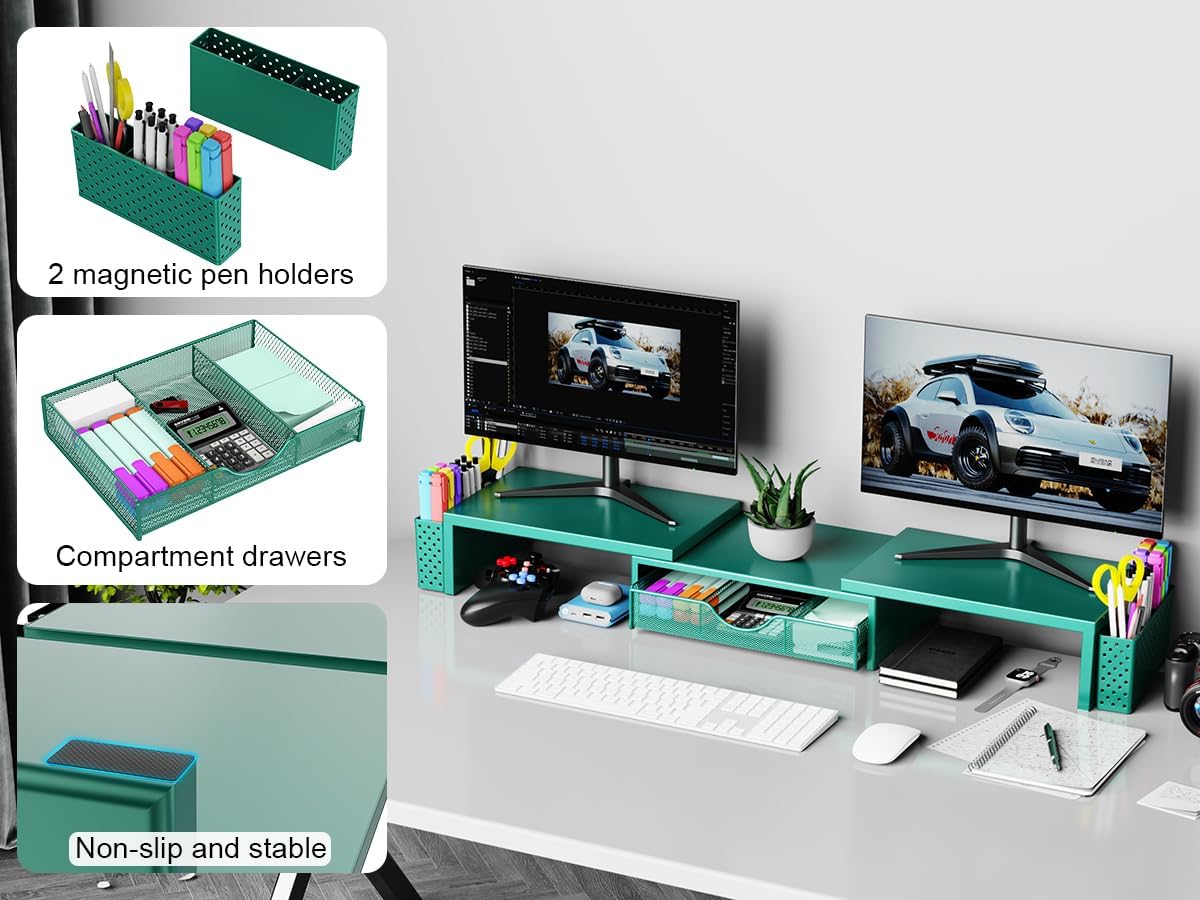Spacrea Metal Desk Organizers and Accessories, Dual Monitor Stand Riser with Drawer and 2 Pen Holders, Desk Accessories & ...
