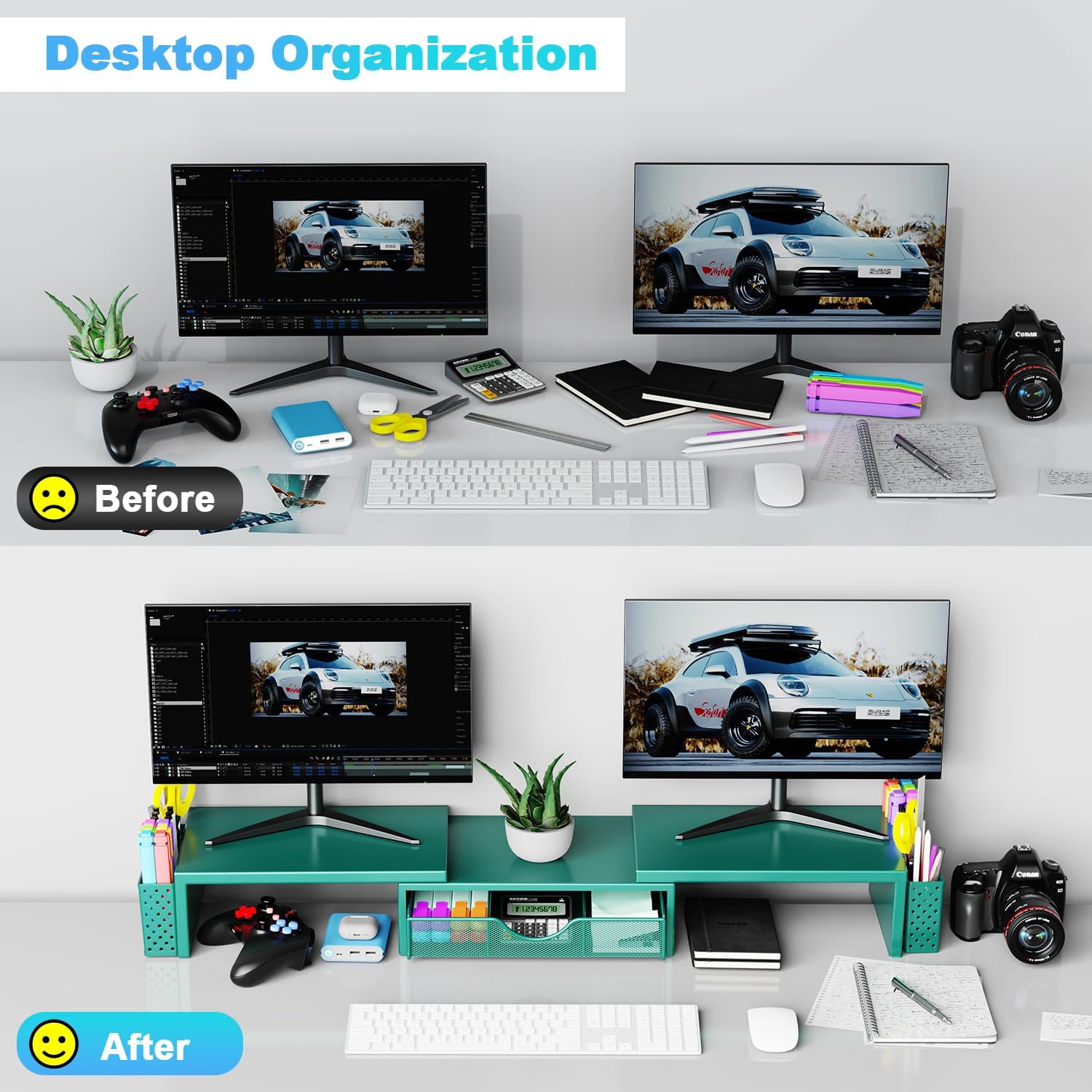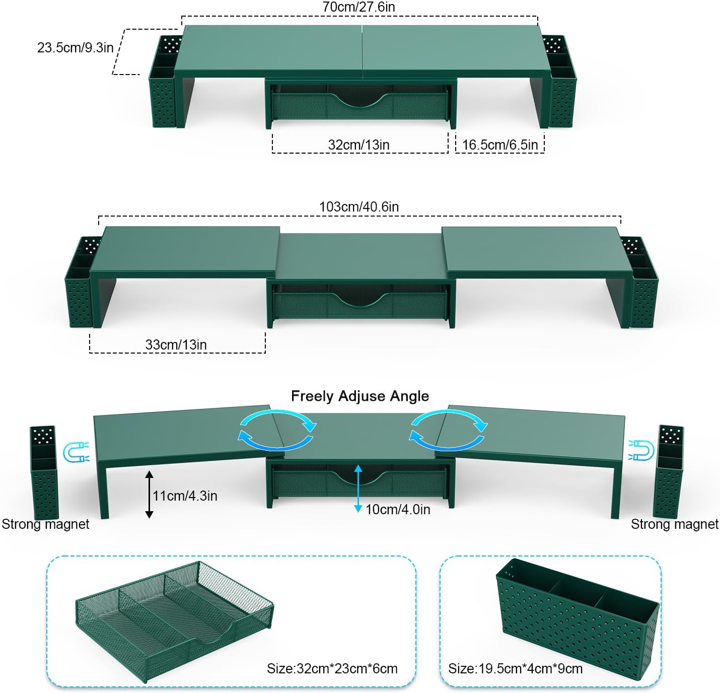 Dual-screen office efficiency improvement: This desktop organizer is equipped with a dual-display stand, which can place two monitors at the same time, effectively expanding the workspace. It also has adjustable length (27.6-40.6 inches) and angle to provide you with a better viewing experience.