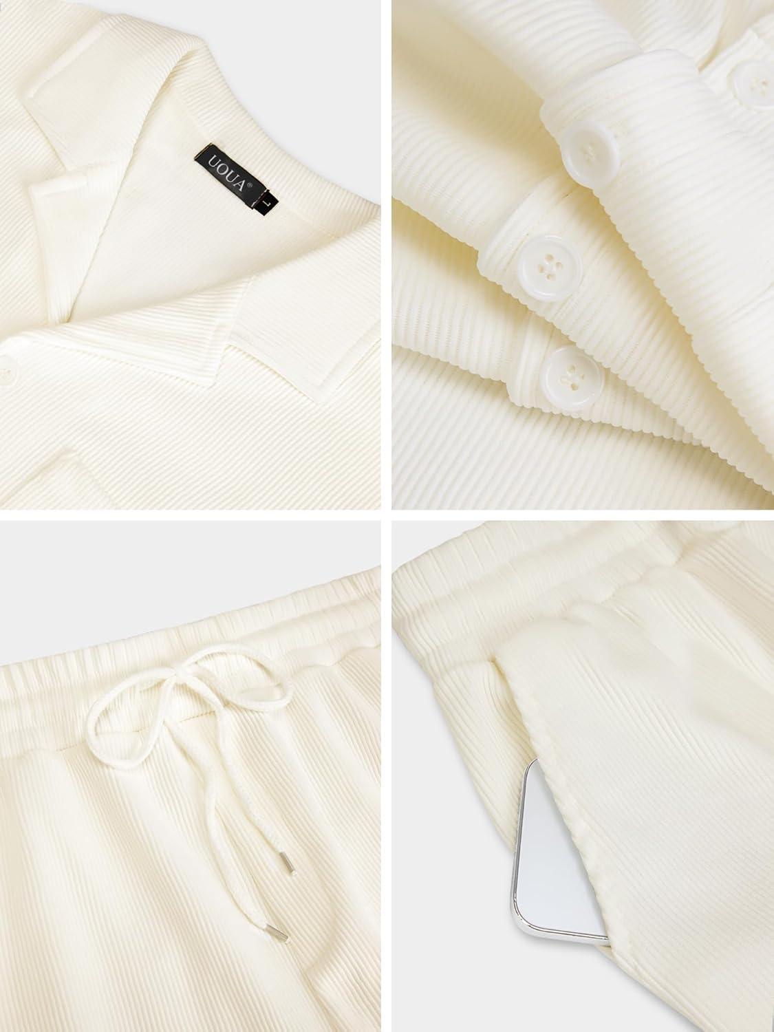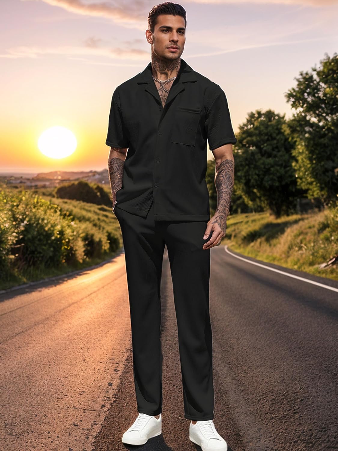 Timeless Design: The classic combination of buttoned short sleeve shirt with a Cuban collar, and casual pants with an elastic waistband and two side pockets saves you time when choosing matching outfits. It's fashion-forward yet effortless
