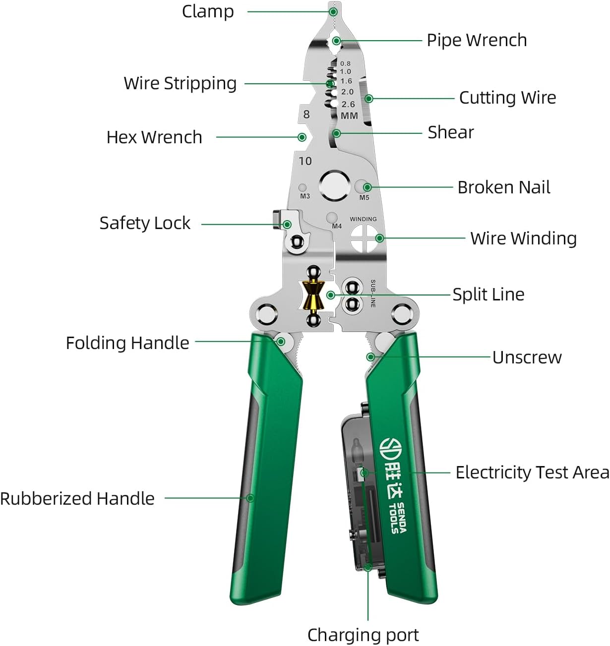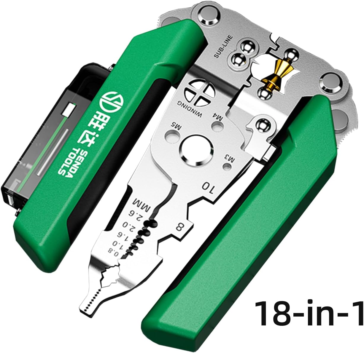 Robust Construction and Electricity Measurement Function: Made from premium chrome vanadium steel, the tool offers exceptional durability and strength. 18 in 1 Foldable Wire Stripper with Electricity Measurement Function & Dual Alarms