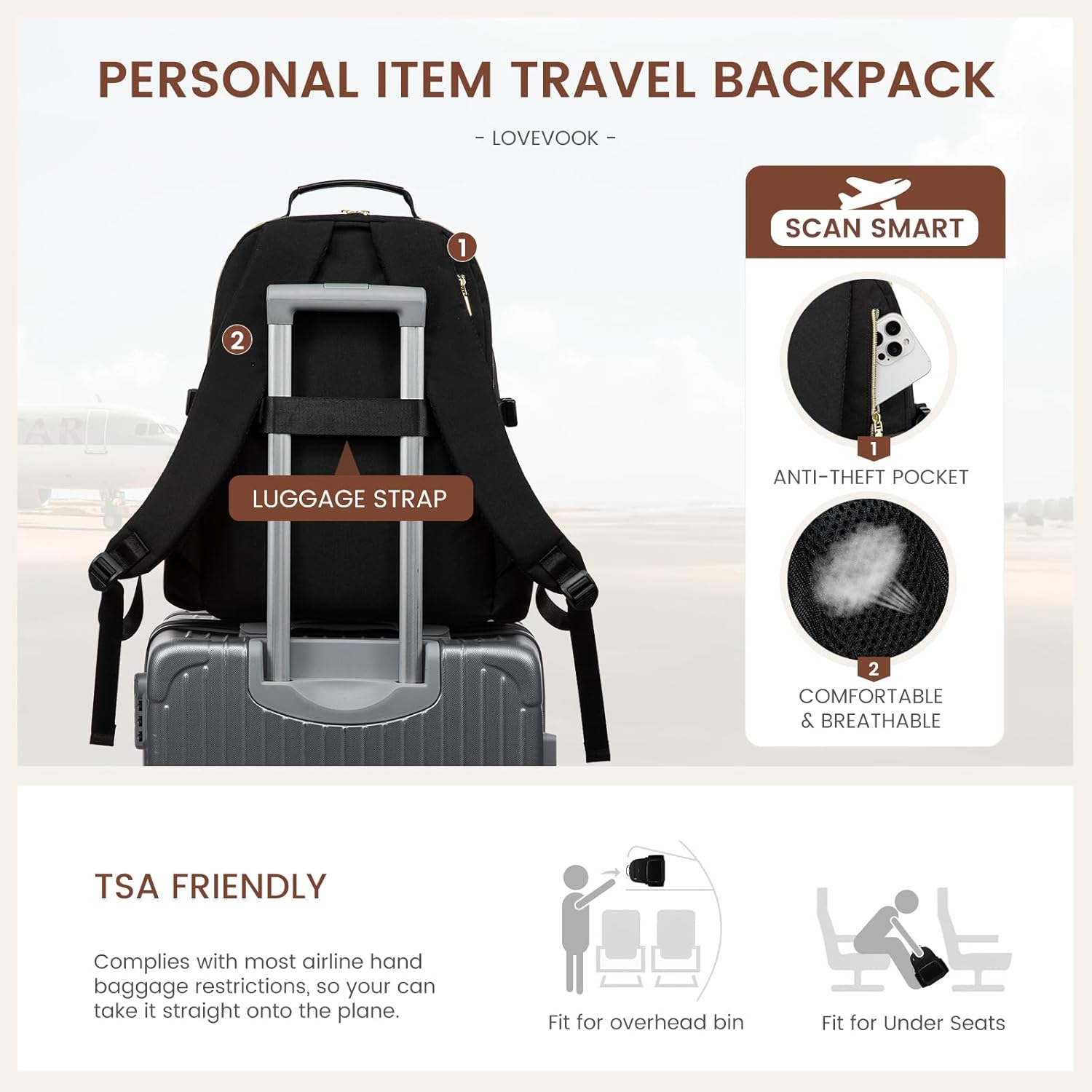 ??【Personal Item Travel Backpack】: Backpack for traveling on airplane,fits great under the seat on the plane! The adjustable and mesh airflow WELL-PADDED SHOULDER STRAPS are nice and cushioned so they don’t hurt your shoulders. The ANTI-THEFT POCKET on the back design and waterproof material give you peace of mind while traveling.The LUGGAGE STRAP DESIGN on the back that allows it to ship over your suitcase handle for an easy push through the airport!
