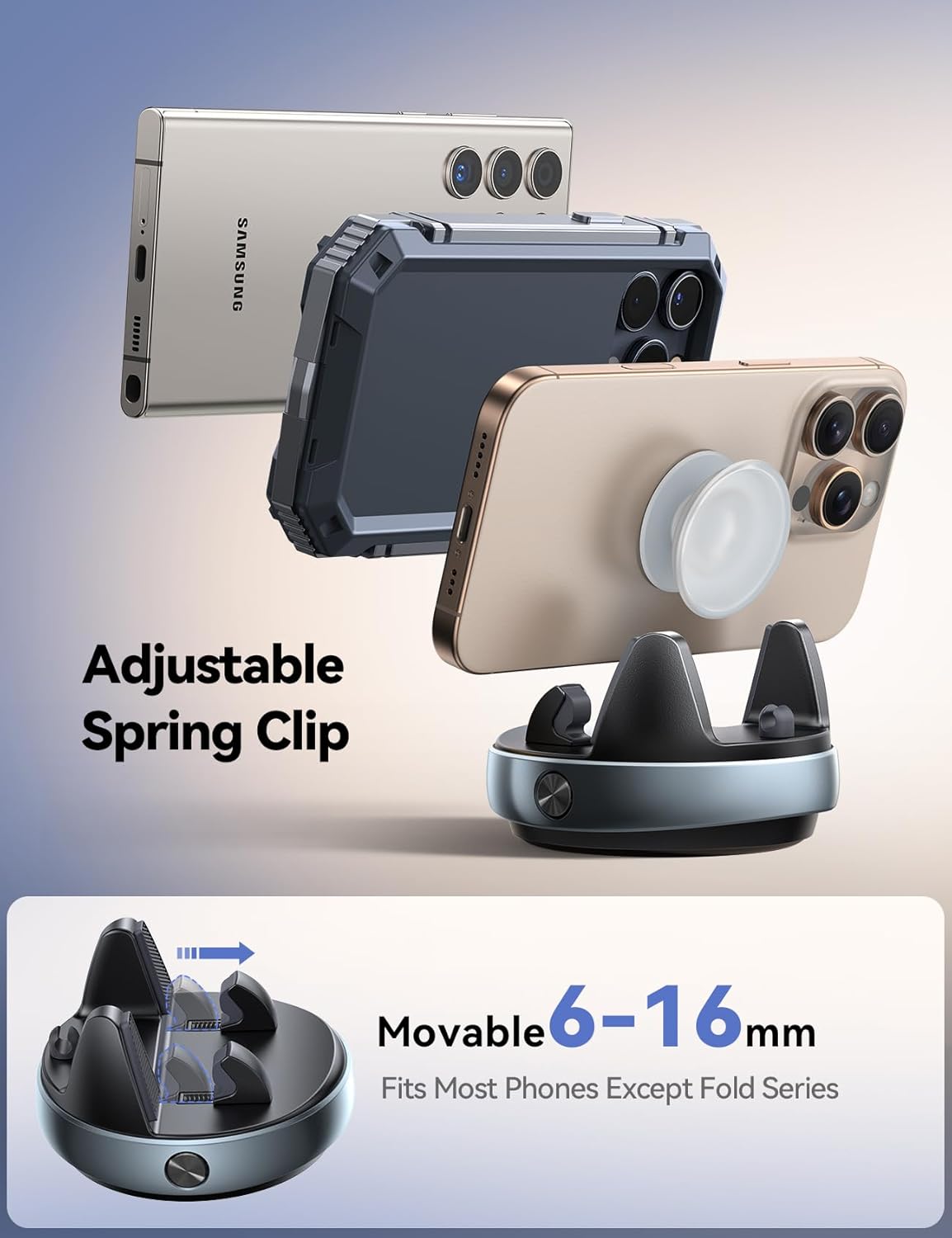 【Adjustable Spring Design Base】JOYROOM 2024's newly upgraded car phone holder mount features an adjustable spring design that is compatible with cell phones with thicknesses ranging from 6-16mm, making it friendly to thick cases.
