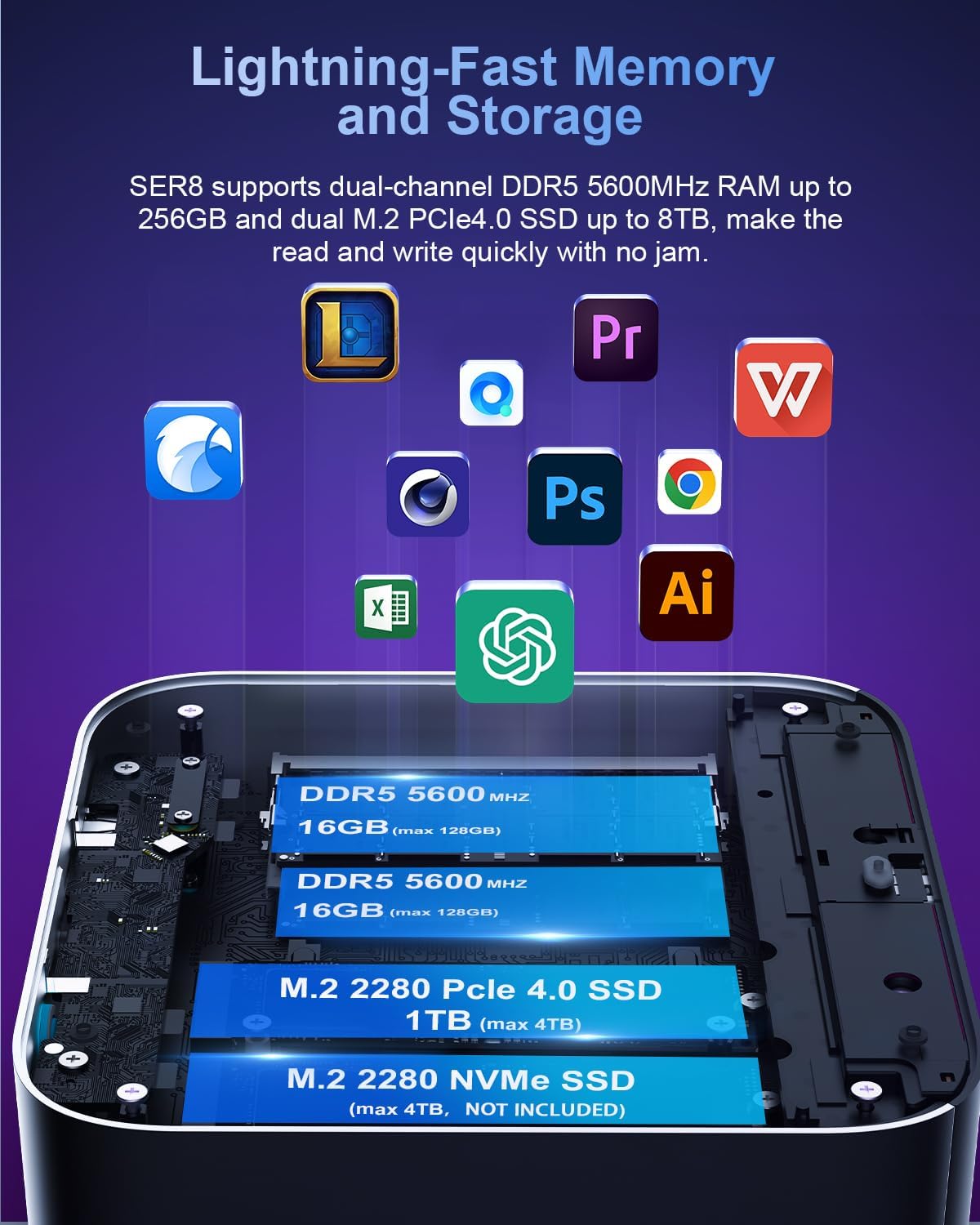 【Large Capacity & Expand Friendly】Beelink 8745HS mini pc comes with 32GB dual channel DDR5-5600MHz RAM (16GB*2, max 256GB) and 1TB M.2 PCIe 4.0 SSD (dual SSD slots, max 4TB*2) . Large capacity helps to save more large programs in the mini desktop pc and brings smoother operation of multi-tasking. High-speed SSD enables quicker load time of large files, high resolution content and large-scale games