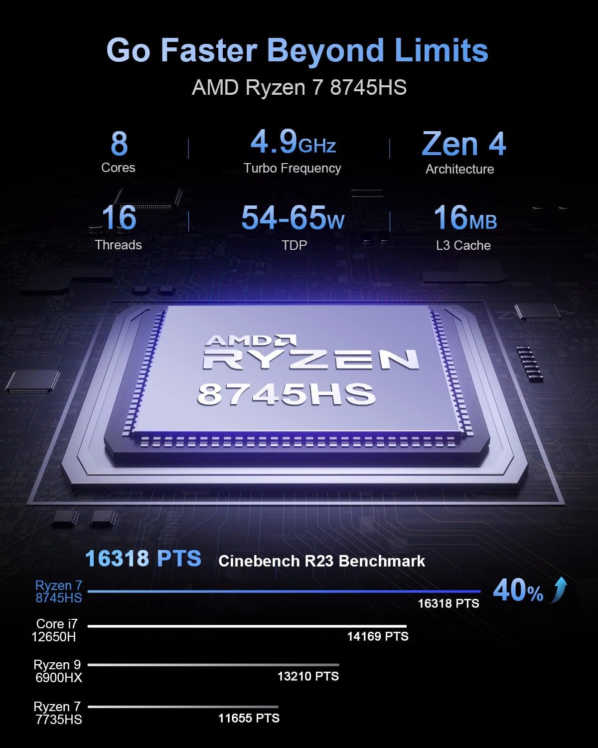 【Beelink Next Gen Powerhouse】The Latest Beelink SER8 mini pc is powered by AMD Ryzen 7 8745HS processor (3.8GHz-4.9GHz, 8 cores 16 threads, 16M L3 Cache, Zen 4 architecture, 28% performance boost over the Ryzen 7 7735HS). Perfect for streaming high-definition videos, editing high-resolution images, engaging in professional-level design work and playing popular games like LoL, CS:GO, DOTA2, PUBG.