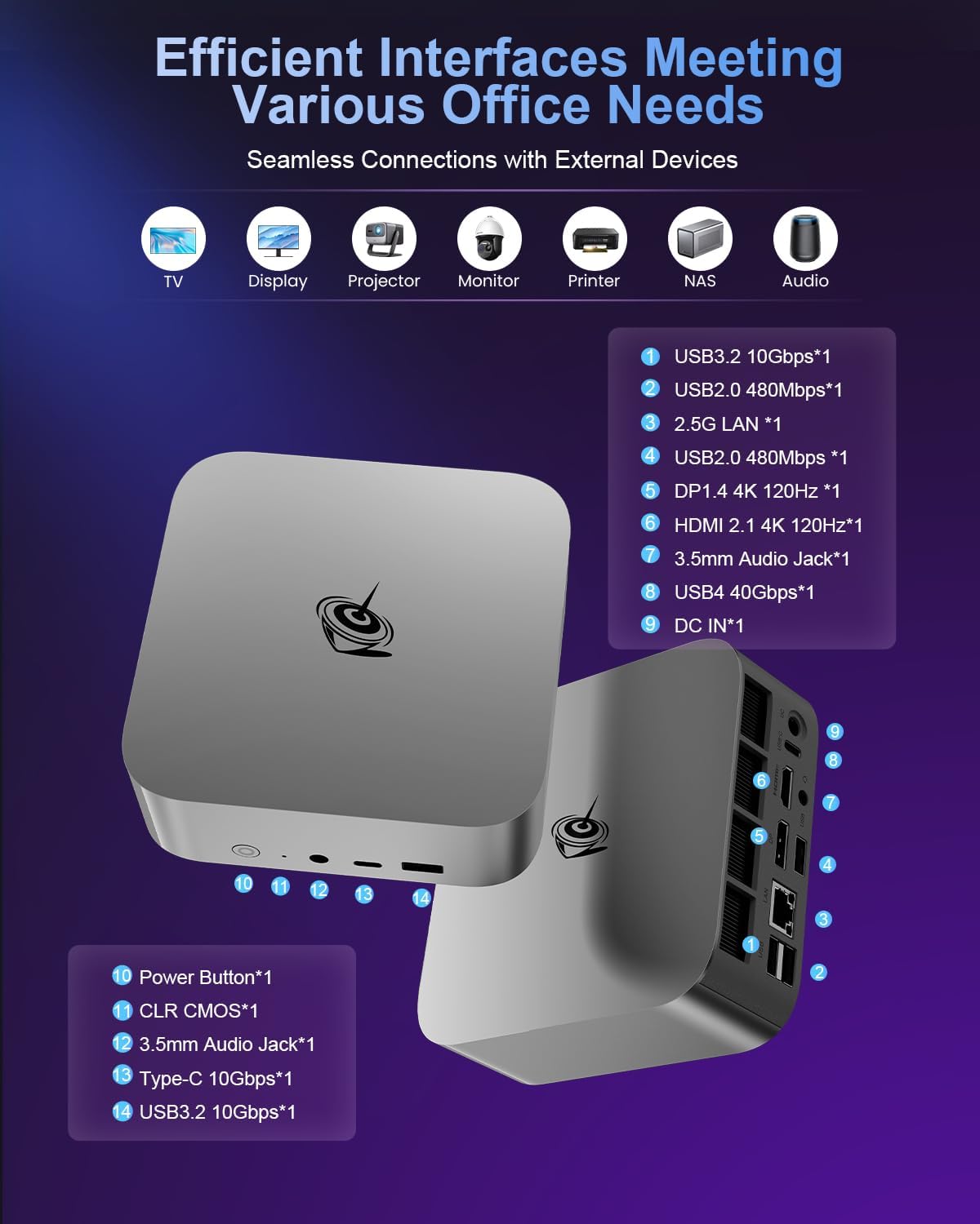 【High Performance Mini Gaming PC】Beelink Ryzen 7 mini pc integrates an AMD Radeon 780M GPU with RDNA3 architecture, 12 cores and a top speed of 2600MHz, which has excellent performance in 4K HD video playback and gaming. Game recommendation: LOL, DOTA 2, PUBG, CSGO, GTA 4/5, Apex Legends etc. This mini computer can connect three displays simultaneously via 1*HDMI2.1 + 1*DP1.4 + 1*USB4 ports, highly enhancing your productivity