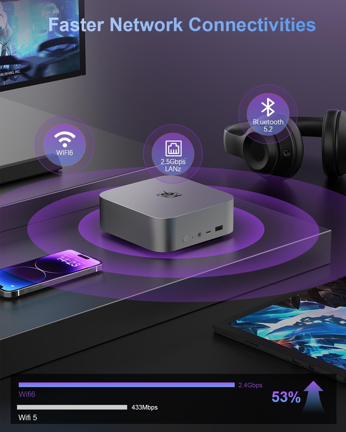 【High-speed Network Connectivity】Beelink mini pc ryzen 7 equipped with 2.5G LAN port, dual-band WiFi 6 (Intel AX200), transmission speed up to 2.4Gbps, three times faster than WiFi5. Lower latency Bluetooth5.2 brings faster data transfer, more stable and efficient to connect to multiple wireless devices such as projector, printer, monitor, speakers and etc