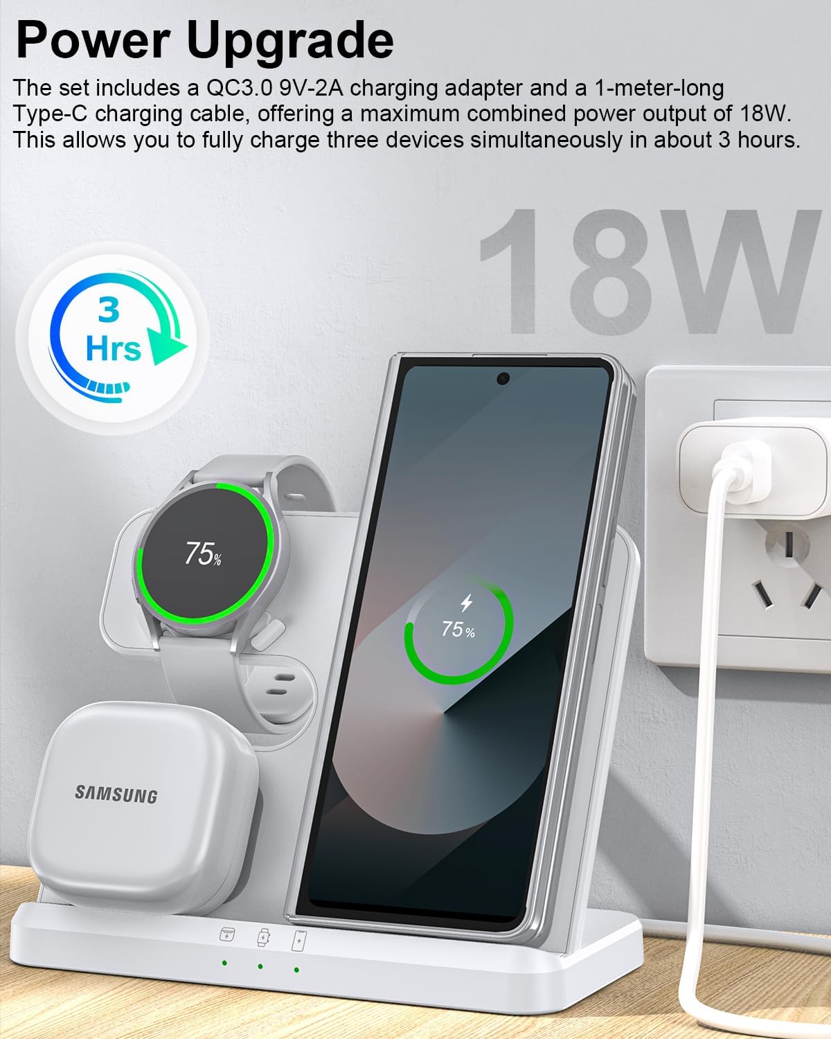 3 in 1 Wireless Charger: Simultaneously charge your phone, watch, and earbuds. Equipped with QC3.0 technology, it can fully charge all 3 devices in about 3 hours. The 3 in 1 design minimizes cable clutter and keeps your space tidy. Perfect for offices, bedside tables, or living rooms, it easily meets multi-device charging needs