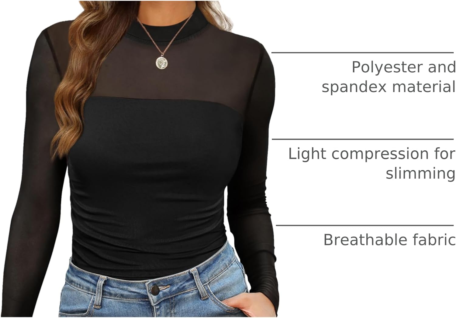 Womens Fashion: This mesh long sleeve top women is a little sexy but still very classy. The mock turtleneck and sheer mesh sleeves add a touch of temptation, and are designed with layered pleats from the chest to the waist for a more design-friendly fit.