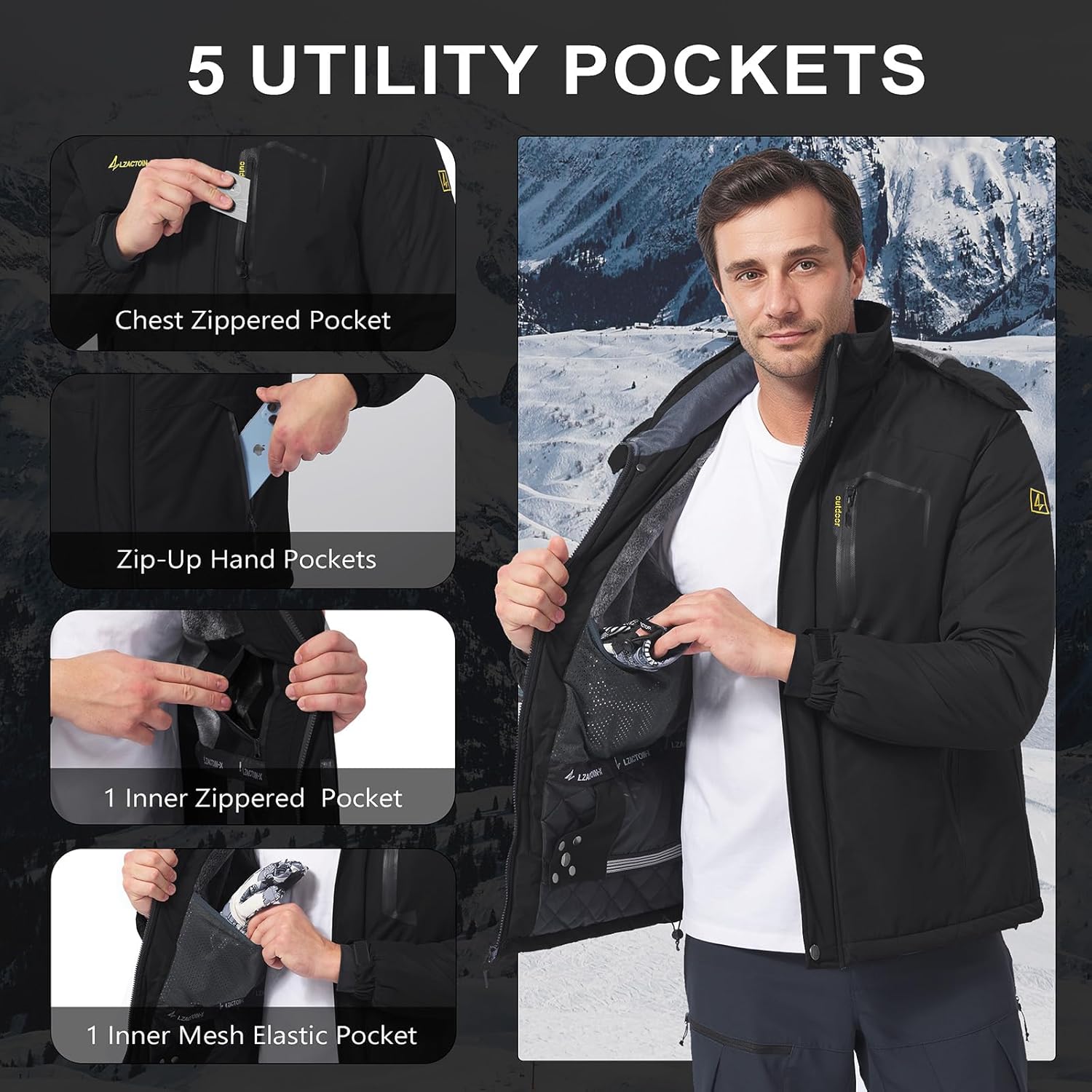 【5 BIG WATERPROOF POCKETS】: Men's skiing jacket has 2 zippered hand pockets, 1 zippered chest pocket, 1 internal big mesh pocket, and 1 internal secure zippered pocket—suitable for storing your phone, wallet, ski gloves and other accessories. All zippered pockets are waterproof to keep items dry.