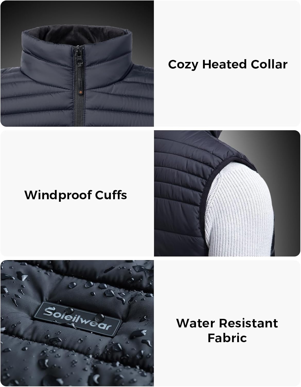 3 Adjustable Heat Settings & Fast Heating: Features premium carbon fiber heating elements that heat up in seconds. Soleilwear heated vest provides with 3 temperature levels (Low ~104°F / 40°C, Medium ~122°F / 50°C, High ~140°F / 60°C) to suit different weather conditions and personal preferences.One-button operation is easy even with gloves on.