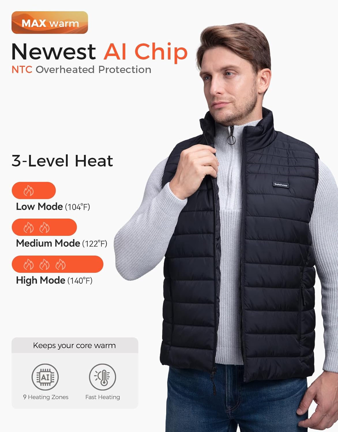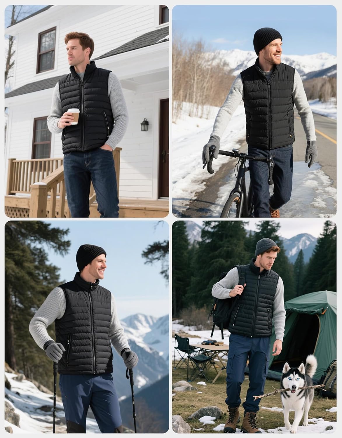 9 Heating Zones for Full-Body Warmth: Designed with 9 heating panels (collar, two long strips on the front, and two large zones on the back), this heated vest delivers even heat to key areas, keeping you warm and comfortable during indoor and outdoor activities like working, hiking, fishing, skiing, cycling, and camping.