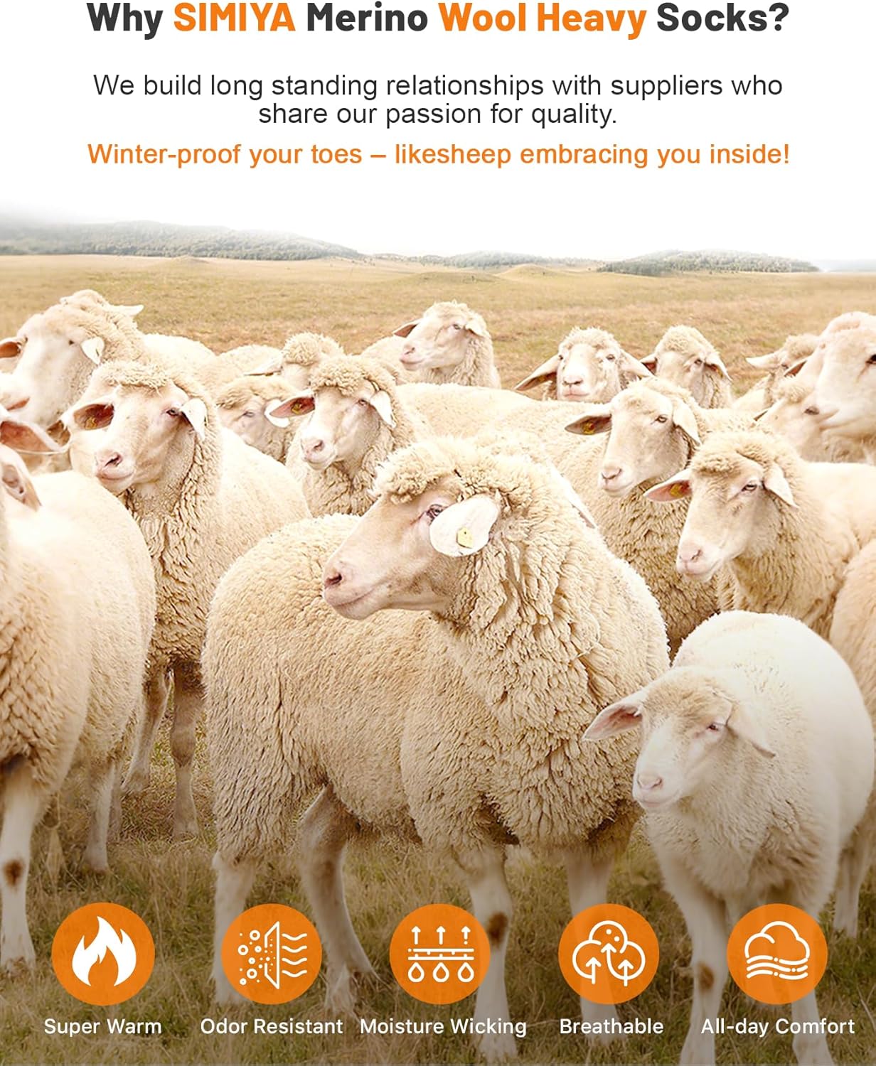 SIMIYA Merino Wool Socks for Men, 5 Pairs Thermal Warm Hiking Super Thick Crew Work Cushion Sock for Mens Winter Cold Weather