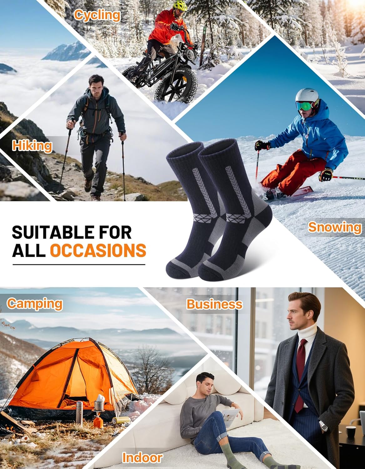 More Awesome Features? Smart Details, Smarter Performance. Thermal socks shock-absorbing ankle stripes prevent blisters. Wool socks for mens features cushioned soles absorbs shock during long hikes, non-slip elastic cuffs, reinforced toe/heel ensure long-lasting durability for all-day comfort. Arch support technology‌ reduces foot fatigue by 40%. Strategic cushioning zones absorb impact at heels/toes, while seamless toe stitching eliminates friction points