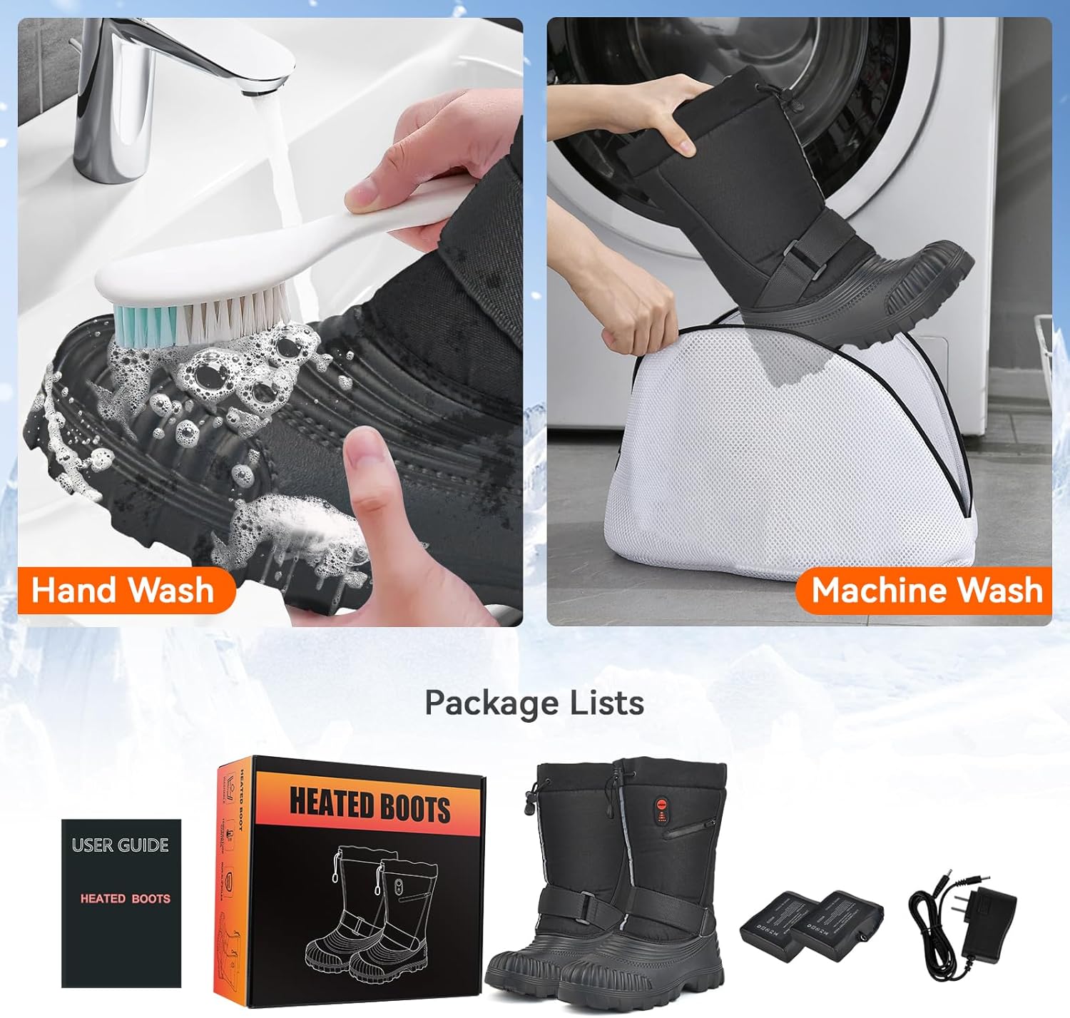 3 Levels Temperature Controller Snow Boots--The heated Snow Boots features three temperature settings(High: 140℉, Medium: 130℉, Low: 110℉), give you the ability to customize the temperature to your liking. You can adjust its three heat settings via a one-touch control, so it’s simple to use. And the heated boots for men got toasty warm in 15 seconds, so you don’t have to wait long to feel the warmth.