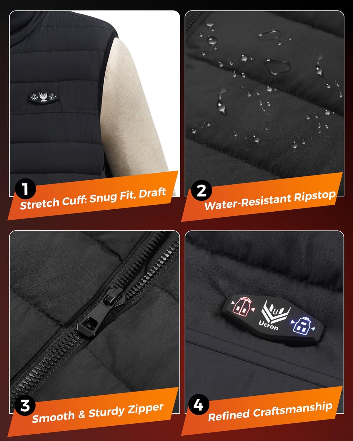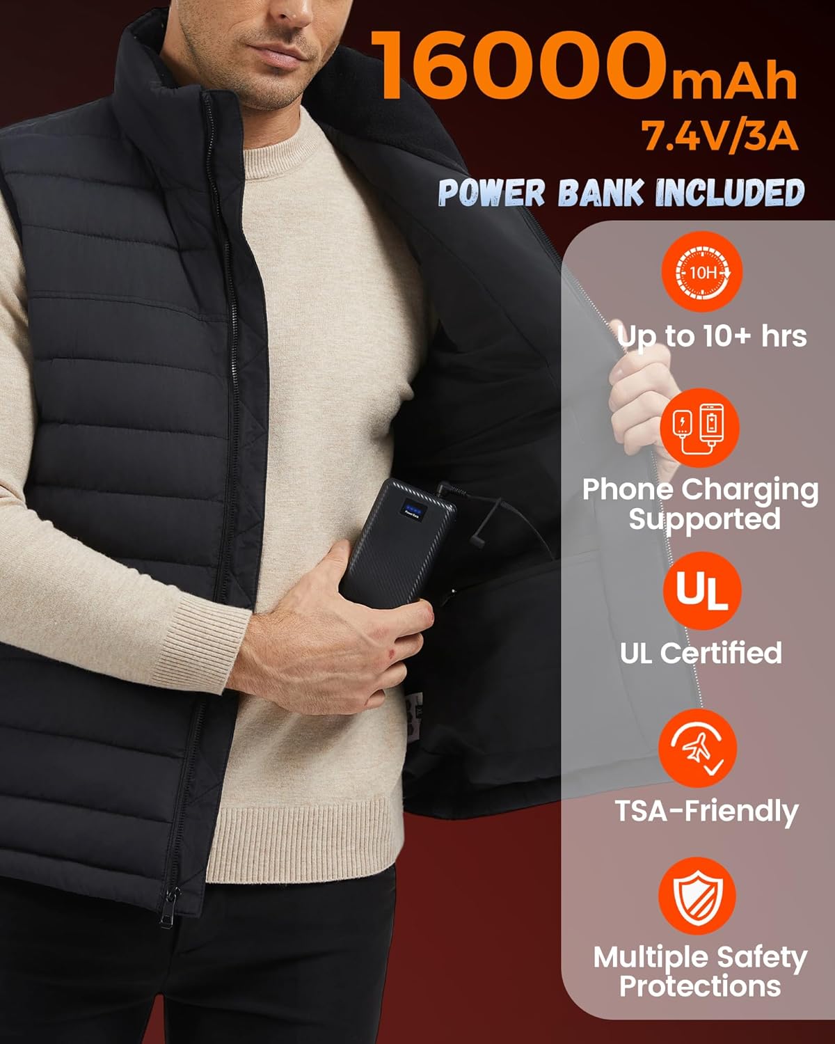 Long-Lasting Battery with Full Protection - Our men's heated vest powered by a robust 16000mAh battery for up to 10 hours of warmth on a single charge. Built-in intelligent safeguards (overheat/overvoltage/short-circuit protection). Certified for reliable performance, it ensures peace of mind during extended use. It also serves as a power bank to keep your devices charged on the go. The battery is flight-approved for travel.