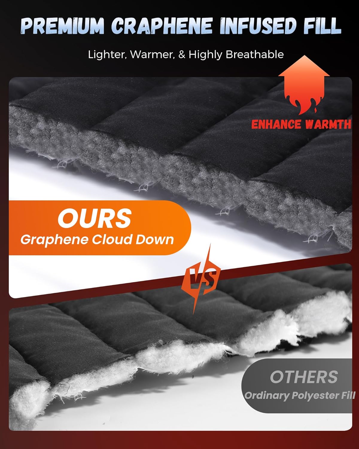 Premium Graphene Cloud-Down Filling - Unlike ordinary polyester fill, our innovative graphene-infused cloud-down lining offers superior thermal retention with lightweight comfort. The filling has a distinctive, premium grey hue due to the inclusion of graphene. It locks in your body heat and the warmth from the heating panels—ideal for skiing, fishing, or winter sports.
