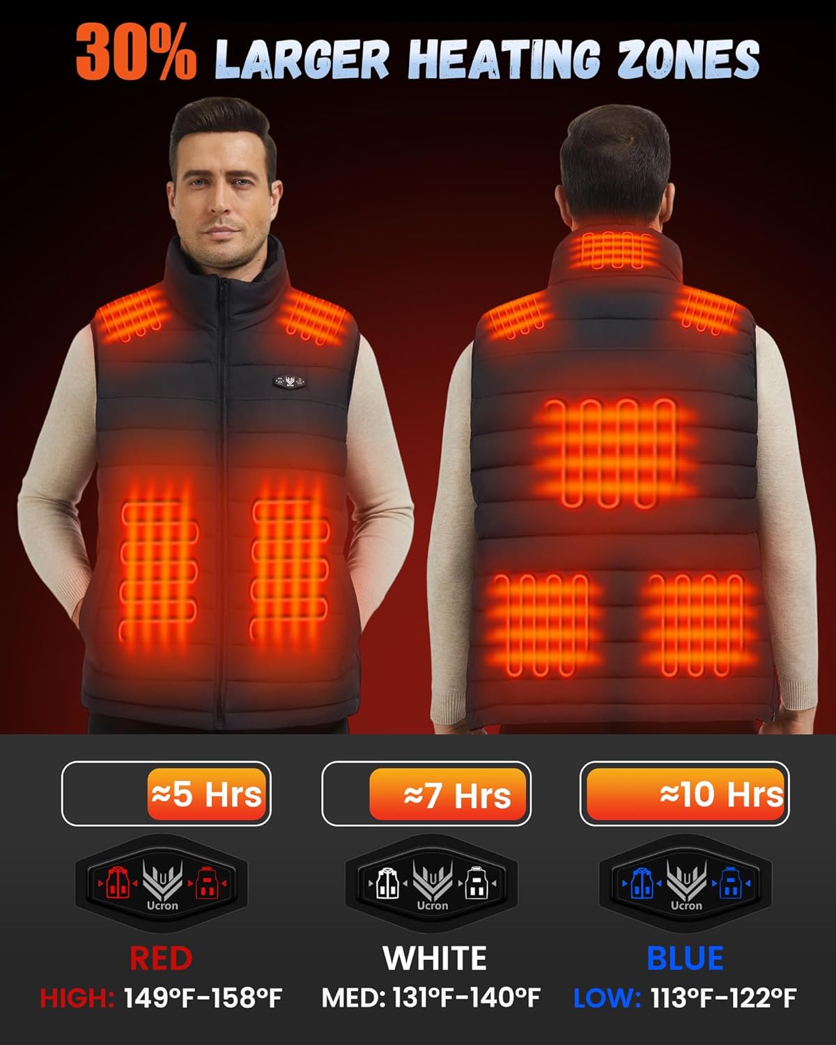 Independent Temperature Control for Different Areas - Two independent buttons control heating in different areas of the vest. Premium carbon fiber heating elements heat up within seconds, offering 3 adjustable temperature levels: (High≈149°, Medium≈131°F, and Low≈113°F). One-button control works effortlessly, even with gloves.