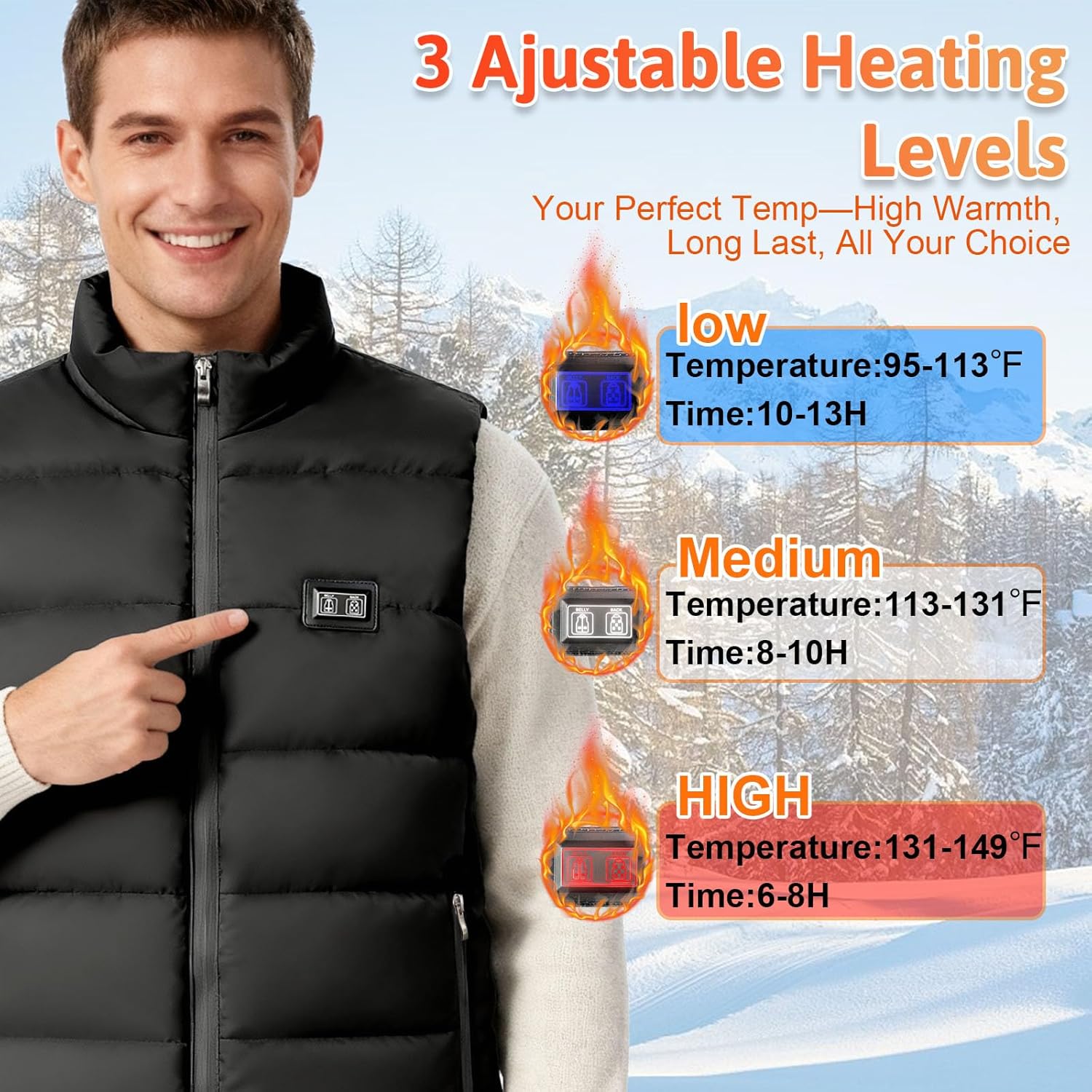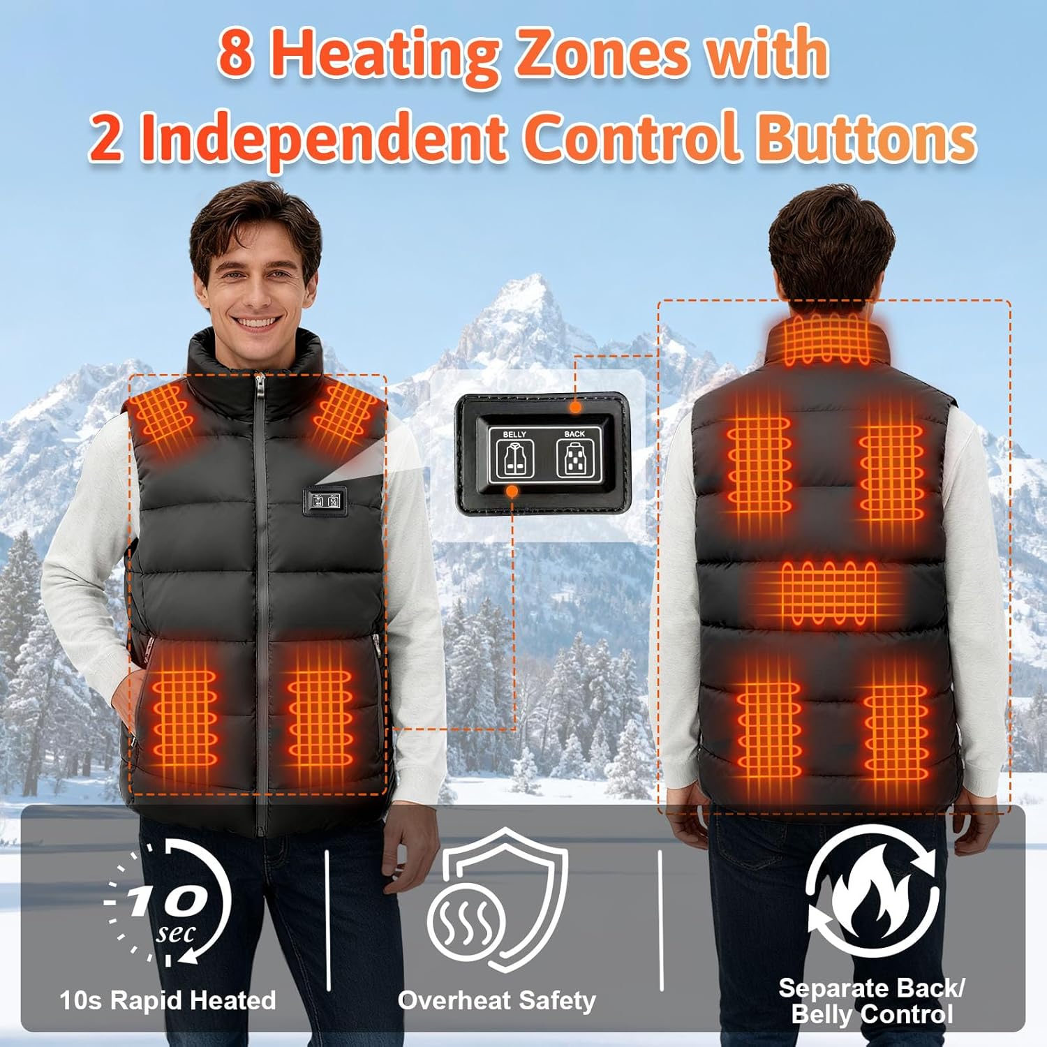 8 Precision Heating Zones + 3-Level Temp Control: Target cold spots with 8 built-in carbon fiber heating elements (back, abdomen, shoulders, waist) for core warmth. Adjust heat with 3 levels (low/medium/high) and independent back/abdomen switches—perfect for hiking, commuting, or casual outings where personalized comfort matters.