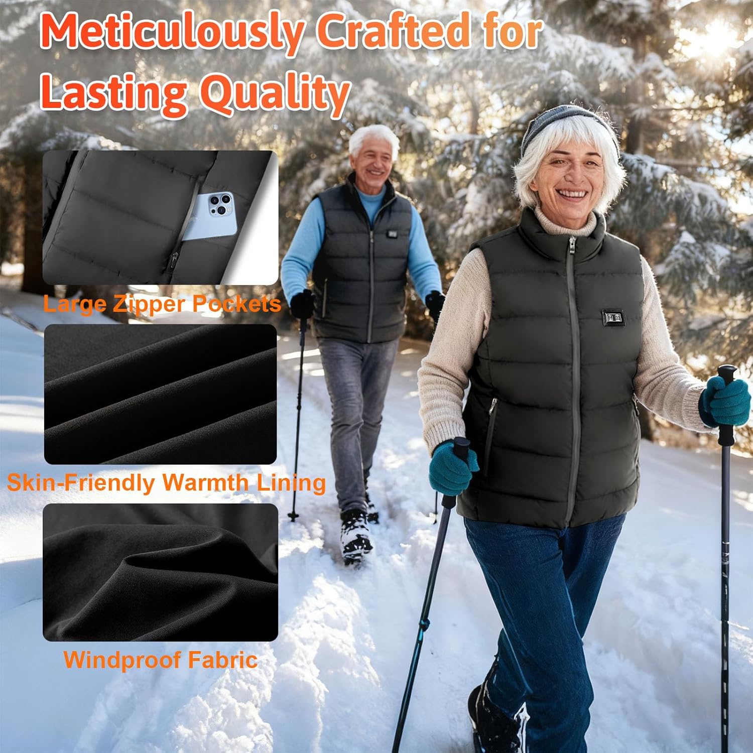 Windproof, Lightweight & Breathable Design: Made with tight-weave polyester, this heated vest blocks wind while trapping heat. Slim, flexible fit moves with you—no bulk, no restrictions. Two zip pockets keep hands warm or store phones/keys—ideal for active lifestyles.