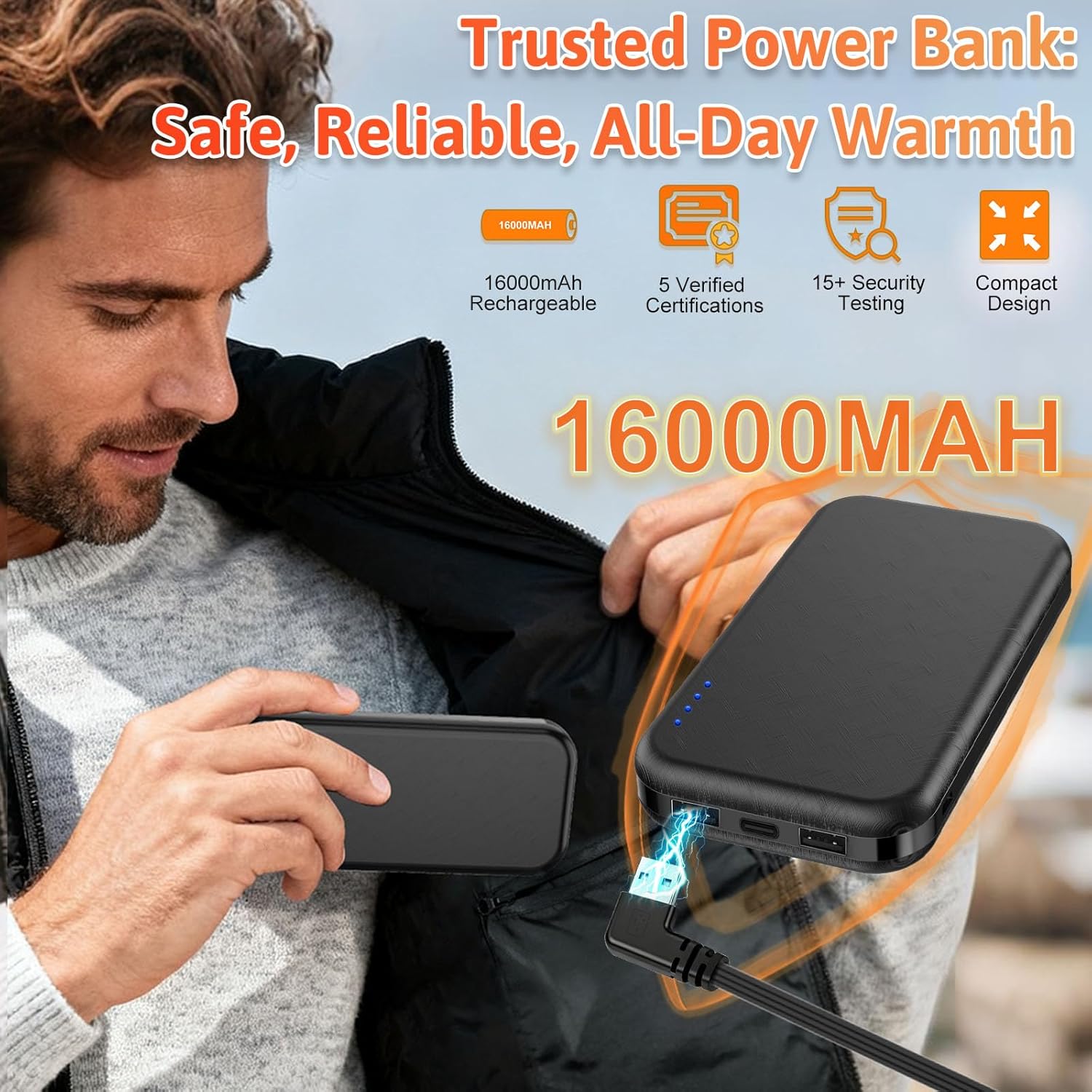 All-Day Warmth with Included 16000mAh Battery: Stay powered with the included 16000mAh battery (heats in seconds, 8-13 hours per charge based on heat level). Overload protection auto-adjusts temperature to prevent overheating—safe, consistent warmth for busy days outdoors or on the go.