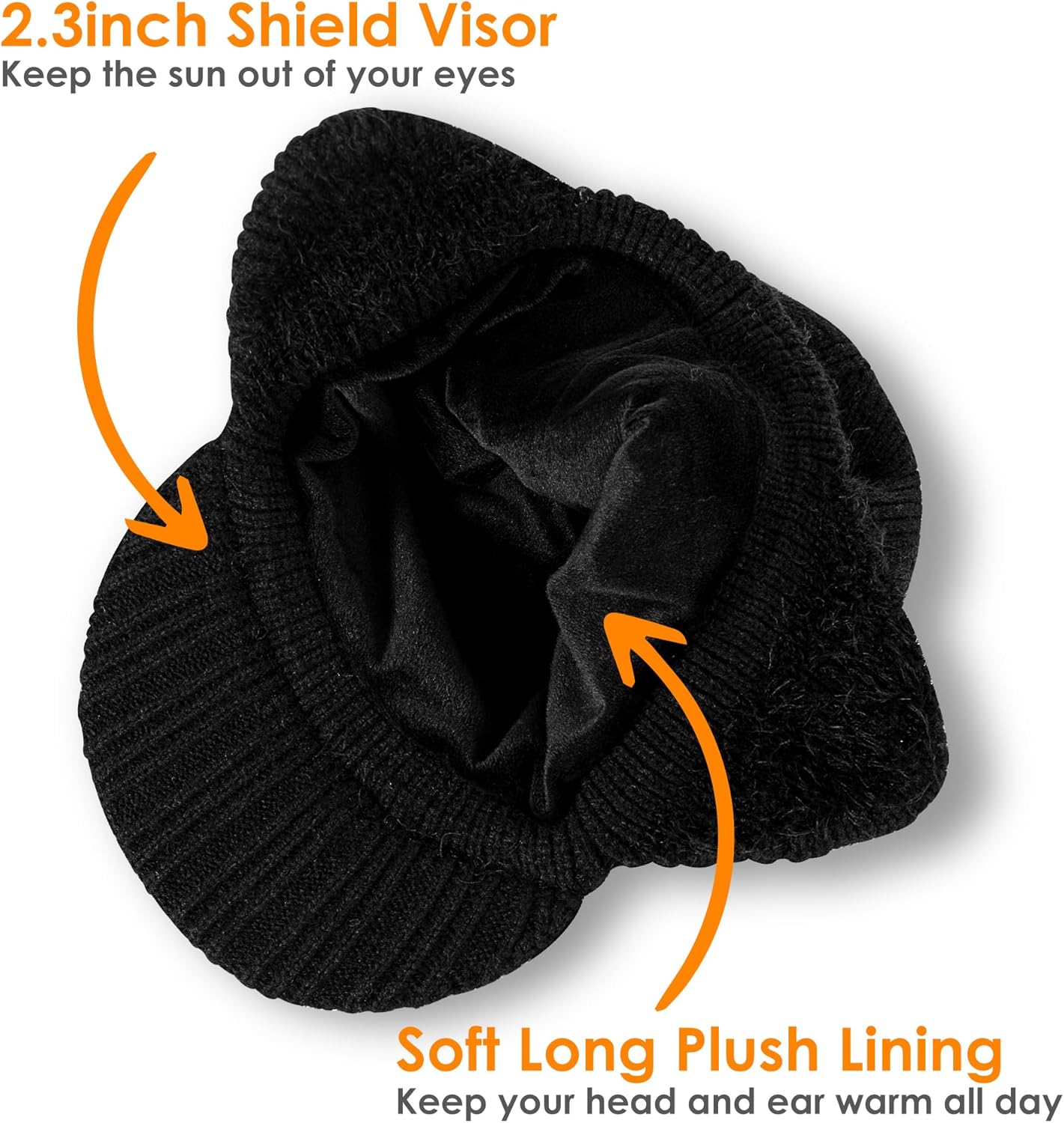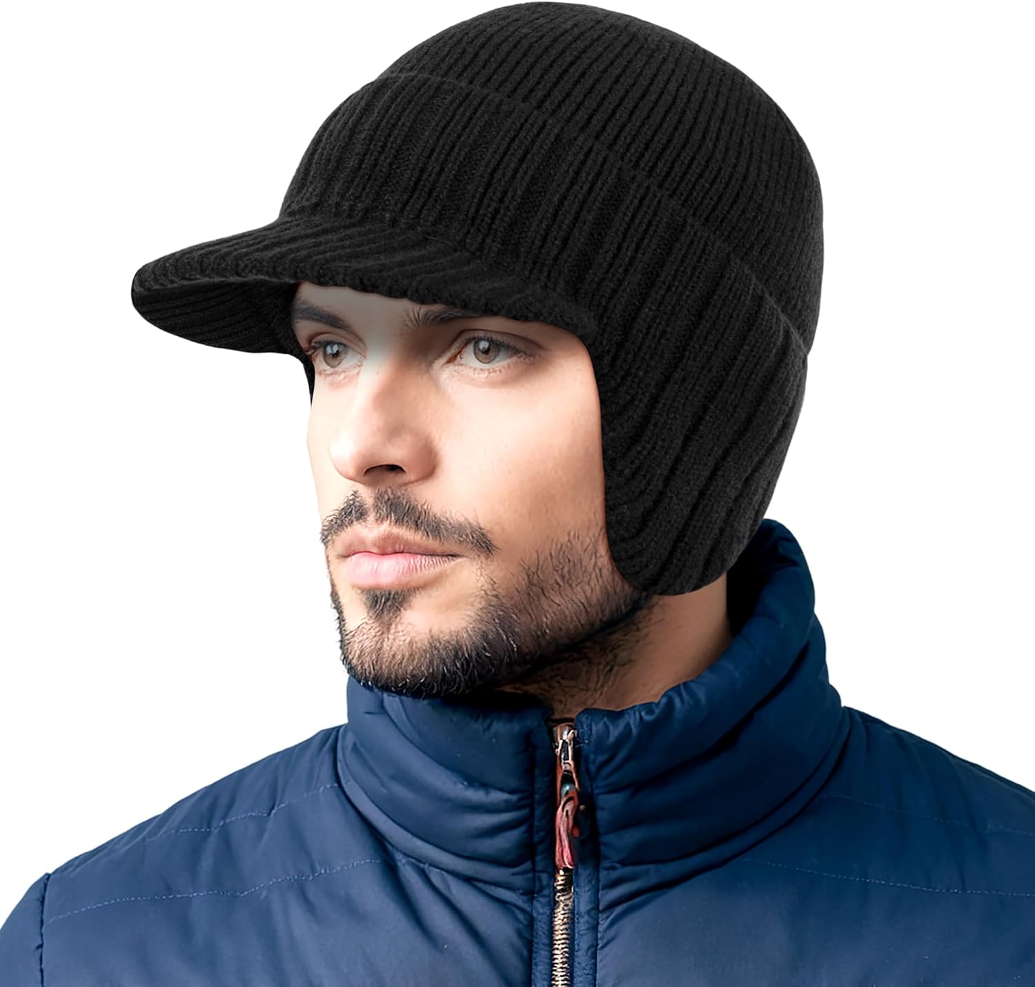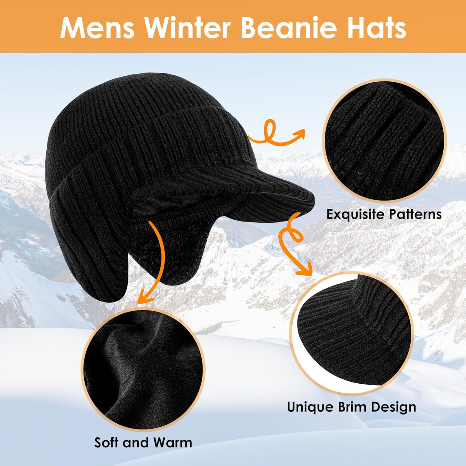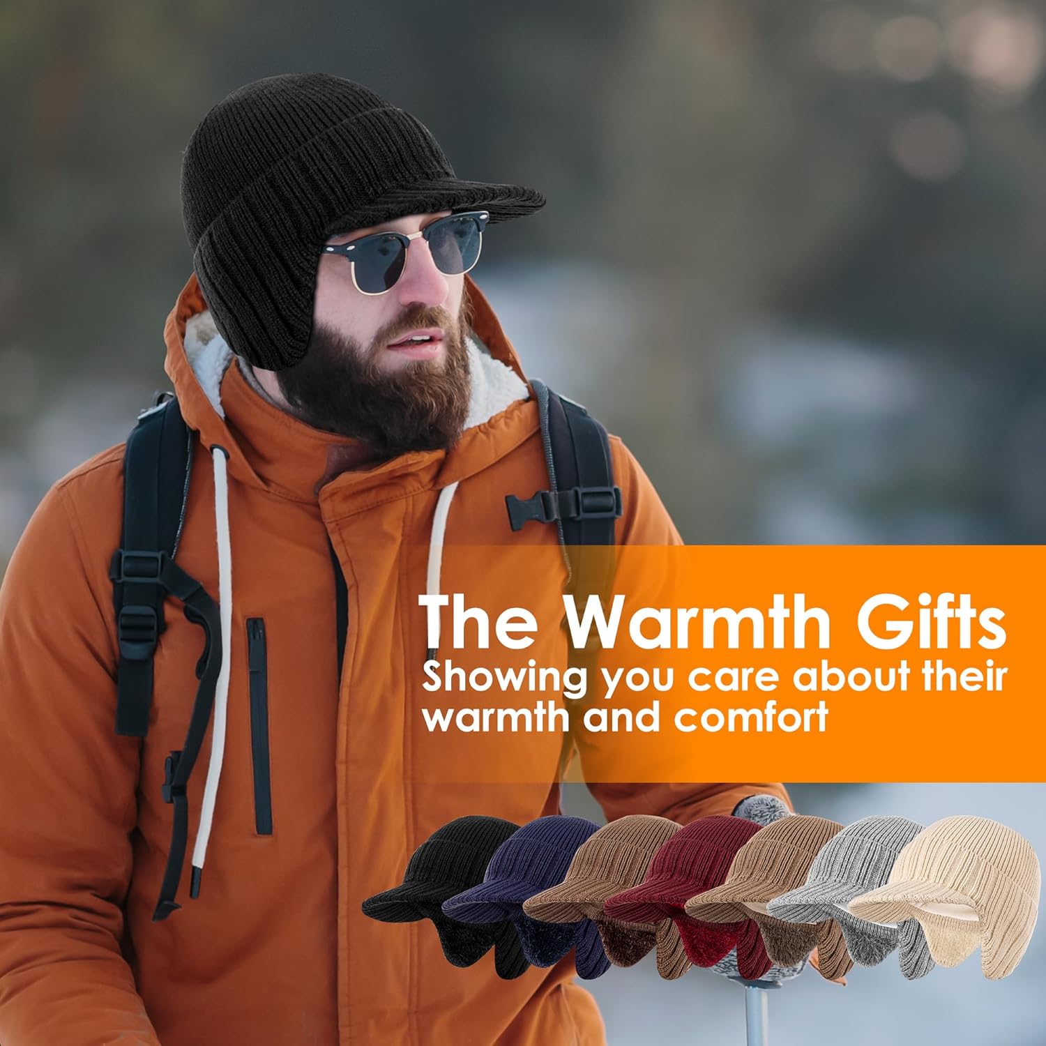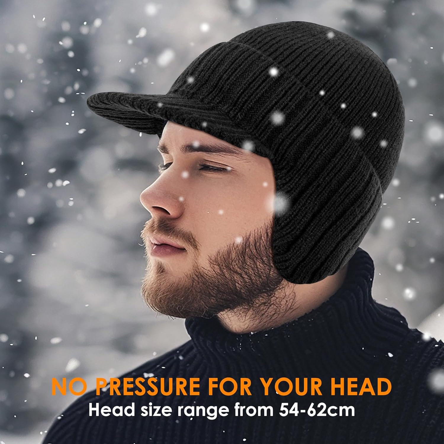 Teqihat Winter Beanie with Brim and Ear Flaps for Men, Knitted hat with Fleece Lining for Warmth Caps for Men Women