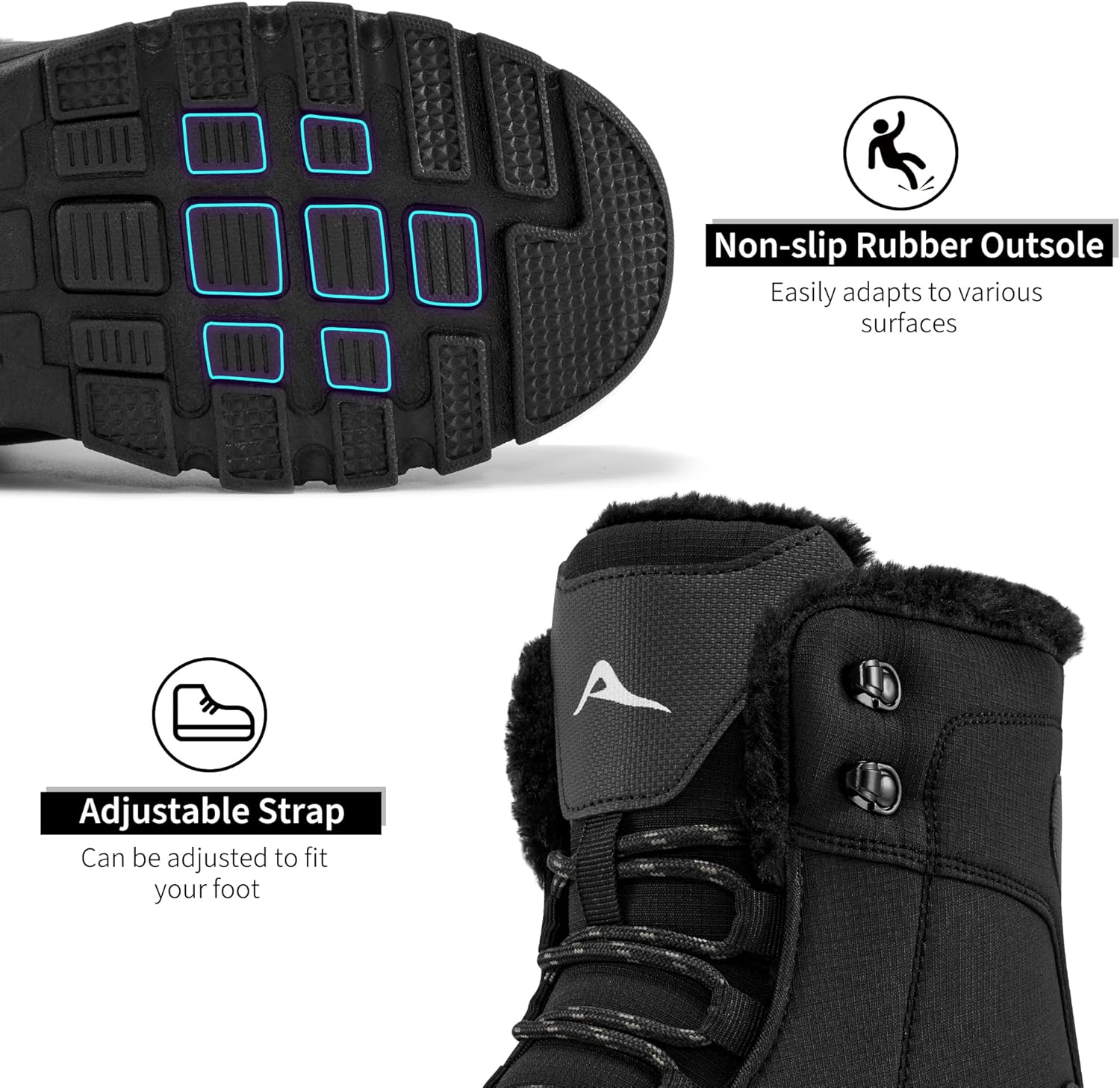 Design: Snow boots for men feature a lace-up design for adjustable and secure fit. Anti-collision toe cap protects the toe from injury. The padded neckline provides strong ankle support and prevents sprains. Snow boots, winter boots
